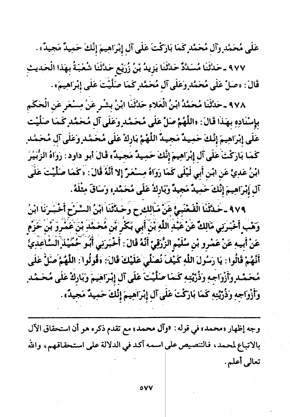 977 - حَدَّثَنَا مُسَدَّدٌ، حَدَّثَنَا يَزِيدُ بْنُ زُرَيْعٍ، حَدَّثَنَا شُعْبَةُ، بِهَذَا الْحَدِيثِ، قَالَ: صَلِّ عَلَى مُحَمَّدٍ، وَعَلَى آلِ مُحَمَّدٍ، كَمَا صَلَّيْتَ عَلَى إِبْرَاهِيمَ.