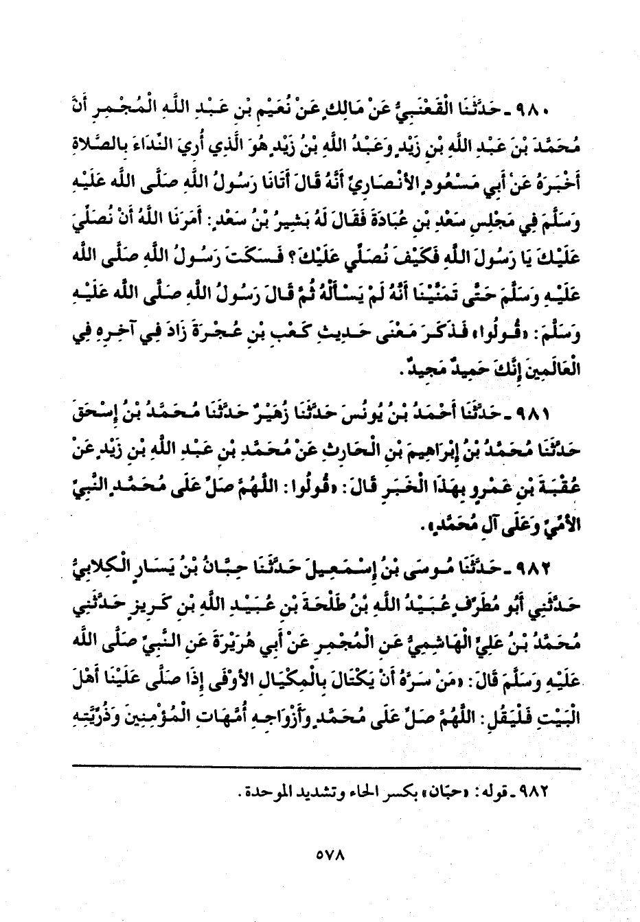 982 - حَدَّثَنَا مُوسَى بْنُ إِسْمَاعِيلَ، حَدَّثَنَا حِبَّانُ بْنُ يَسَارٍ الْكِلَابِيُّ، حَدَّثَنِي أَبُو مُطَرِّفٍ عُبَيْدُ اللَّهِ بْنُ طَلْحَةَ بْنِ عُبَيْدِ اللَّهِ بْنِ كَرِيزٍ، حَدَّثَنِي مُحَمَّدُ بْنُ عَلِيٍّ الْهَاشِمِيُّ، عَنِ الْمُجْمِرِ، عَنْ أَبِي هُرَيْرَةَ، عَنِ النَّبِيِّ صَلَّى اللهُ عَلَيْهِ وَسَلَّمَ قَالَ: " مَنْ سَرَّهُ أَنْ يَكْتَالَ بِالْمِكْيَالِ الْأَوْفَى، إِذَا صَلَّى عَلَيْنَا أَهْلَ الْبَيْتِ، فَلْيَقُلْ: اللَّهُمَّ صَلِّ عَلَى مُحَمَّدٍ، وَأَزْوَاجِهِ أُمَّهَاتِ الْمُؤْمِنِينَ، وَذُرِّيَّتِهِ