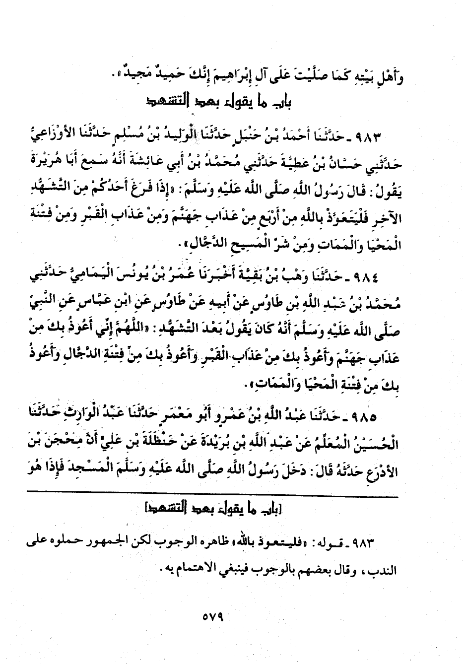 984 - حَدَّثَنَا وَهْبُ بْنُ بَقِيَّةَ، أَخْبَرَنَا عُمَرُ بْنُ يُونُسَ الْيَمَامِيُّ، حَدَّثَنِي مُحَمَّدُ بْنُ عَبْدِ اللَّهِ بْنِ طَاوُسٍ، عَنْ أَبِيهِ، عَنْ طَاوُسٍ، عَنِ ابْنِ عَبَّاسٍ، عَنِ النَّبِيِّ صَلَّى اللهُ عَلَيْهِ وَسَلَّمَ أَنَّهُ كَانَ يَقُولُ بَعْدَ التَّشَهُّدِ: «اللَّهُمَّ إِنِّي أَعُوذُ بِكَ مِنْ عَذَابِ جَهَنَّمَ، وَأَعُوذُ بِكَ مِنْ عَذَابِ الْقَبْرِ، وَأَعُوذُ بِكَ مِنْ فِتْنَةِ الدَّجَّالِ، وَأَعُوذُ بِكَ مِنْ فِتْنَةِ الْمَحْيَا وَالْمَمَاتِ».