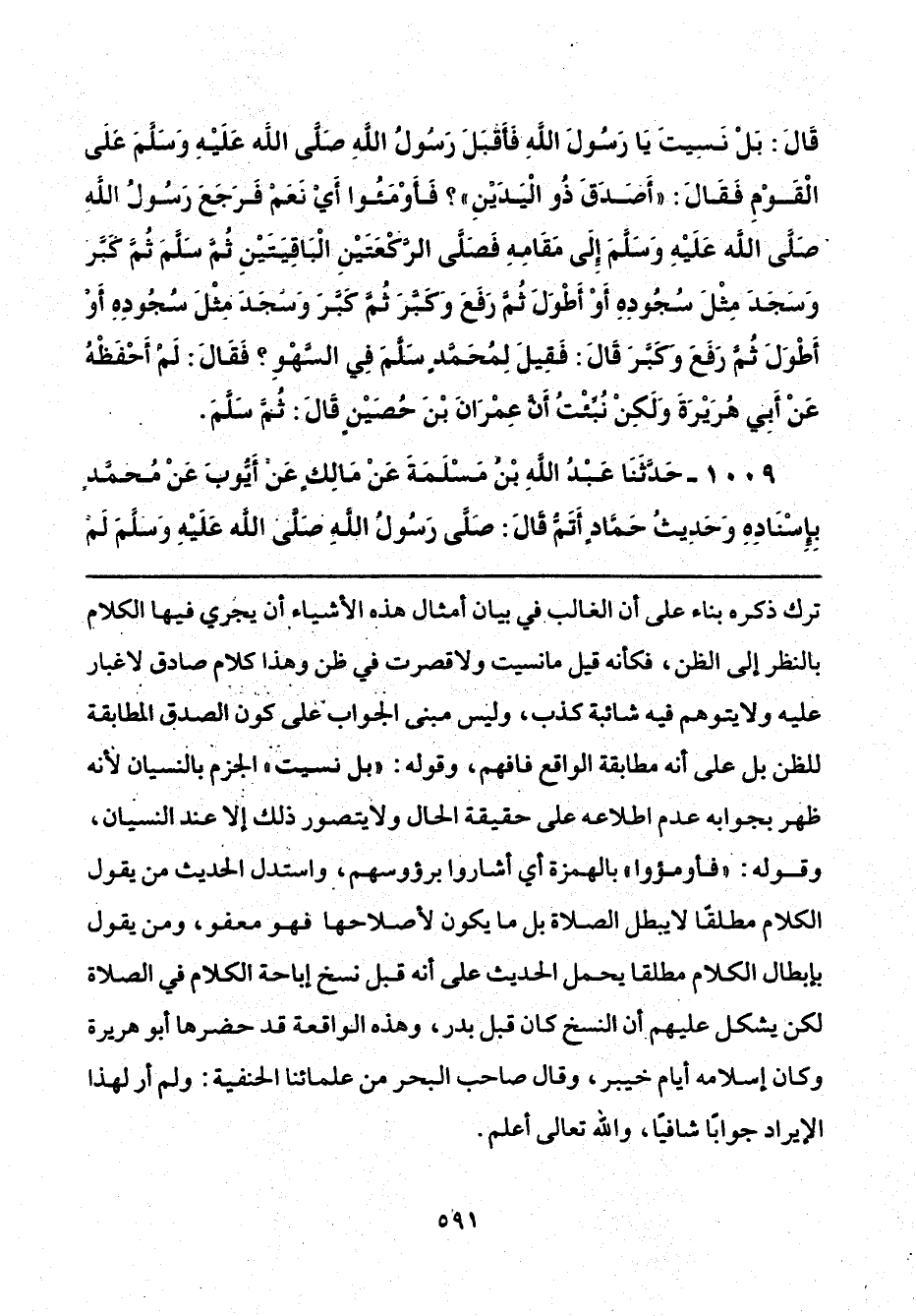 ترك ذكره بناء على أن الغالب في بيان أمثال هذه الأشياء أن يجري فيها الكلام بالنظر إلى الظن، فكأنه قيل ما نسيت ولا قصرت في ظن وهذا كلام صادق لا غبار عليه ولا يتوهم فيه شائبة كذب، وليس مبنى الجواب على كون الصدق المطابقة للظن بل على أنه مطابقة الواقع فافهم، وقوله: "بل نسيت" الجزم بالنسيان لأنه ظهر بجوابه عدم اطلاعه على حقيقة الحال ولا يتصور ذلك إلا عند النسيان، وقوله: "فأومؤوا" بالهمزة أي أشاروا برؤوسهم، واستدل الحديث من يقول الكلام مطلقًا لا يبطل الصلاة بل ما يكون لأصلاحها فهو معفو، ومن يقول بإبطال الكلام مطلقًا يحمل الحديث على أنه قبل نسخ إباحة الكلام في الصلاة لكن يشكل عليهم أن النسخ كان قبل بدر، وهذه الواقعة قد حضرها أبو هريرة وكان إسلامه أيام خيبر، وقال صاحب البحر من علمائنا الحنفية: ولم أر لهذا الإيراد جوابًا شافيًا، والله تعالى أعلم.