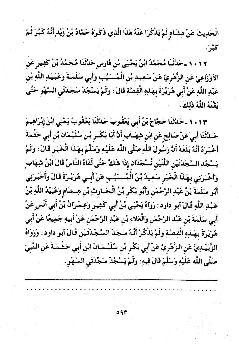 1013 - حَدَّثَنَا حَجَّاجُ بْنُ أَبِي يَعْقُوبَ، حَدَّثَنَا يَعْقُوبُ يَعْنِي ابْنَ إِبْرَاهِيمَ، حَدَّثَنَا أَبِي، عَنْ صَالِحٍ، عَنِ ابْنِ شِهَابٍ، أَنَّ أَبَا بَكْرِ بْنَ سُلَيْمَانَ بْنِ أَبِي حَثْمَةَ، أَخْبَرَهُ أَنَّهُ بَلَغَهُ أَنَّ رَسُولَ اللَّهِ صَلَّى اللهُ عَلَيْهِ وَسَلَّمَ بِهَذَا الْخَبَرِ، قَالَ: وَلَمْ يَسْجُدِ السَّجْدَتَيْنِ اللَّتَيْنِ تُسْجَدَانِ إِذَا شَكَّ حَتَّى لَقَاهُ النَّاسُ، قَالَ ابْنُ شِهَابٍ: وَأَخْبَرَنِي بِهَذَا الْخَبَرِ سَعِيدُ بْنُ الْمُسَيَّبِ، عَنْ أَبِي هُرَيْرَةَ، قَالَ: وَأَخْبَرَنِي أَبُو سَلَمَةَ بْنُ عَبْدِ الرَّحْمَنِ، وَأَبُو بَكْرِ بْنُ الْحَارِثِ بْنِ هِشَامٍ، وَعُبَيْدُ اللَّهِ بْنُ عَبْدِ اللَّهِ، قَالَ أَبُو دَاوُدَ: رَوَاهُ يَحْيَى بْنُ أَبِي كَثِيرٍ، وَعِمْرَانُ بْنُ أَبِي أَنَسٍ، عَنْ أَبِي سَلَمَةَ بْنِ عَبْدِ الرَّحْمَنِ، وَالْعَلَاءِ بْنِ عَبْدِ الرَّحْمَنِ، عَنْ أَبِيهِ، جَمِيعًا، عَنْ أَبِي هُرَيْرَةَ، بِهَذِهِ الْقِصَّةِ وَلَمْ يَذْكُرْ أَنَّهُ سَجَدَ السَّجْدَتَيْنِ، قَالَ أَبُو دَاوُدَ: وَرَوَاهُ الزُّبَيْدِيُّ، عَنِ الزُّهْرِيِّ، عَنْ أَبِي بَكْرِ بْنِ سُلَيْمَانَ بْنِ أَبِي حَثْمَةَ، عَنِ النَّبِيِّ صَلَّى اللهُ عَلَيْهِ وَسَلَّمَ، قَالَ فِيهِ: وَلَمْ يَسْجُدْ سَجْدَتَيِ السَّهْوِ.