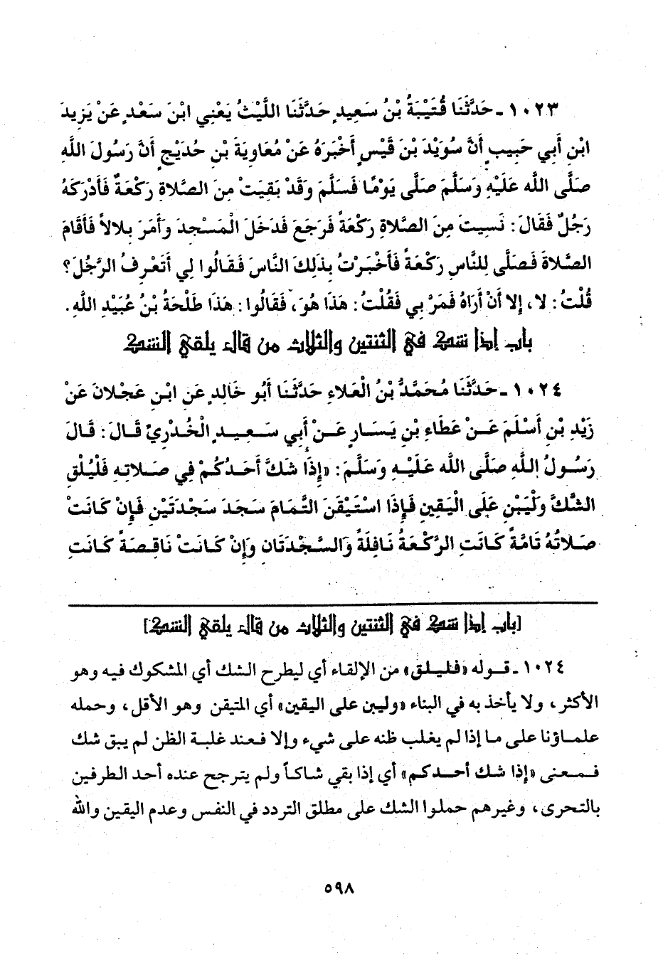 1023 - حَدَّثَنَا قُتَيْبَةُ بْنُ سَعِيدٍ، حَدَّثَنَا اللَّيْثُ يَعْنِي ابْنَ سَعْدٍ، عَنْ يَزِيدَ بْنِ أَبِي حَبِيبٍ، أَنَّ سُوَيْدَ بْنَ قَيْسٍ، أَخْبَرَهُ، عَنْ مُعَاوِيَةَ بْنِ حُدَيْجٍ، أَنَّ رَسُولَ اللَّهِ صَلَّى اللهُ عَلَيْهِ وَسَلَّمَ صَلَّى يَوْمًا فَسَلَّمَ، وَقَدْ بَقِيَتْ مِنَ الصَّلَاةِ رَكْعَةٌ، فَأَدْرَكَهُ رَجُلٌ، فَقَالَ: نَسِيتَ مِنَ الصَّلَاةِ رَكْعَةً، فَرَجَعَ فَدَخَلَ الْمَسْجِدَ، وَأَمَرَ بِلَالًا فَأَقَامَ الصَّلَاةَ، فَصَلَّى لِلنَّاسِ رَكْعَةً، "فَأَخْبَرْتُ بِذَلِكَ النَّاسَ، فَقَالُوا لِي: أَتَعْرِفُ الرَّجُلَ؟ قُلْتُ: لَا، إِلَّا أَنْ أَرَاهُ، فَمَرَّ بِي، فَقُلْتُ: هَذَا هُوَ، فَقَالُوا: هَذَا طَلْحَةُ بْنُ عُبَيْدِ اللَّهِ".