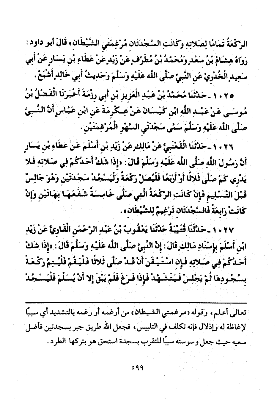 الرَّكْعَةُ تَمَامًا لِصَلَاتِهِ، وَكَانَتِ السَّجْدَتَانِ مُرْغِمَتَيِ الشَّيْطَانِ»، قَالَ أَبُو دَاوُدَ: رَوَاهُ هِشَامُ بْنُ سَعْدٍ، وَمُحَمَّدُ بْنُ مُطَرِّفٍ، عَنْ زَيْدٍ، عَنْ عَطَاءِ بْنِ يَسَارٍ، عَنْ أَبِي سَعِيدٍ الْخُدْرِيِّ، عَنِ النَّبِيِّ صَلَّى اللهُ عَلَيْهِ وَسَلَّمَ وَحَدِيثُ أَبِي خَالِدٍ أَشْبَعُ.