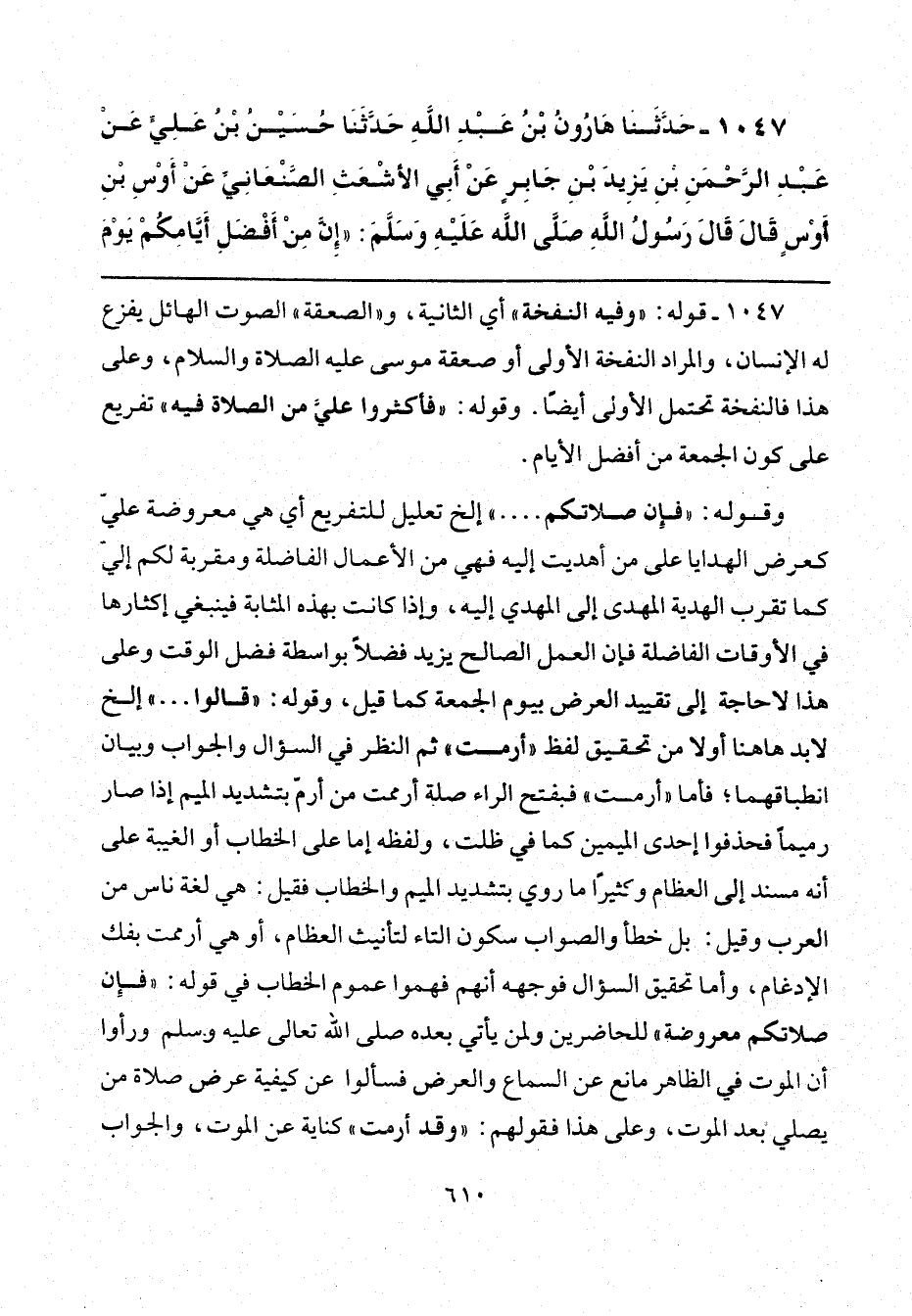 1047 - قوله: "وفيه النفخة" أي الثانية، و"الصعقة" الصوت الهائل يفزع له الإنسان، والمراد النفخة الأولى أو صعقة موسى عليه الصلاة والسلام، وعلى هذا فالنفخة تحتمل الأولى أيضًا. وقوله: "فأكثروا عليَّ من الصلاد فيه" تفريع على كون الجمعة من أفضل الأيام.