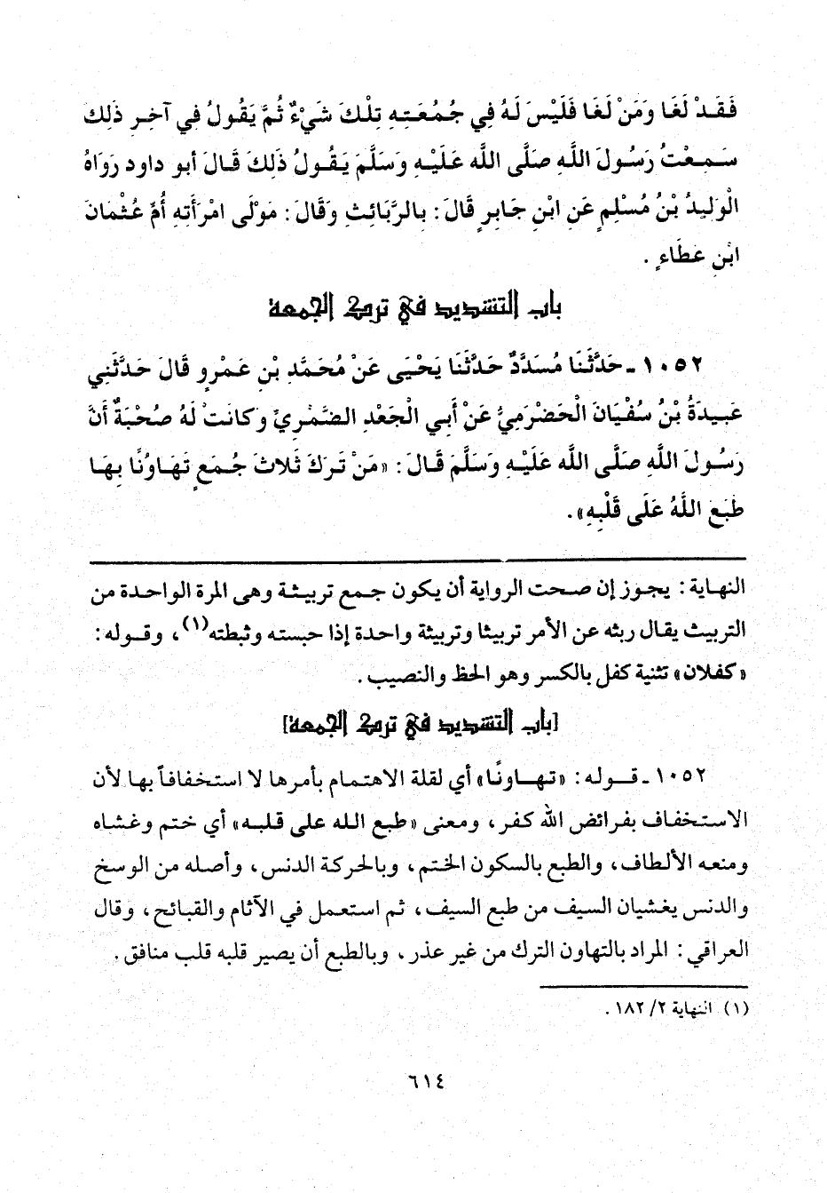 1052 - قوله: "تهاونًا" أي لقلة الاهتمام بأمرها لا استخفافًا بها لأن الاستخفاف بفرائض الله كفر، ومعنى "طبع الله على قلبه" أي ختم وغشاه ومنعه الألطاف، والطبع بالسكون الختم، وبالحركة الدنس، وأصله من الوسخ والدنس يغشيان السيف من طبع السيف، ثم استعمل في الآثام والقبائح، وقال العراقي: المراد بالتهاون الترك من غير عذر، وبالطبع أن يصير قلبه قلب منافق