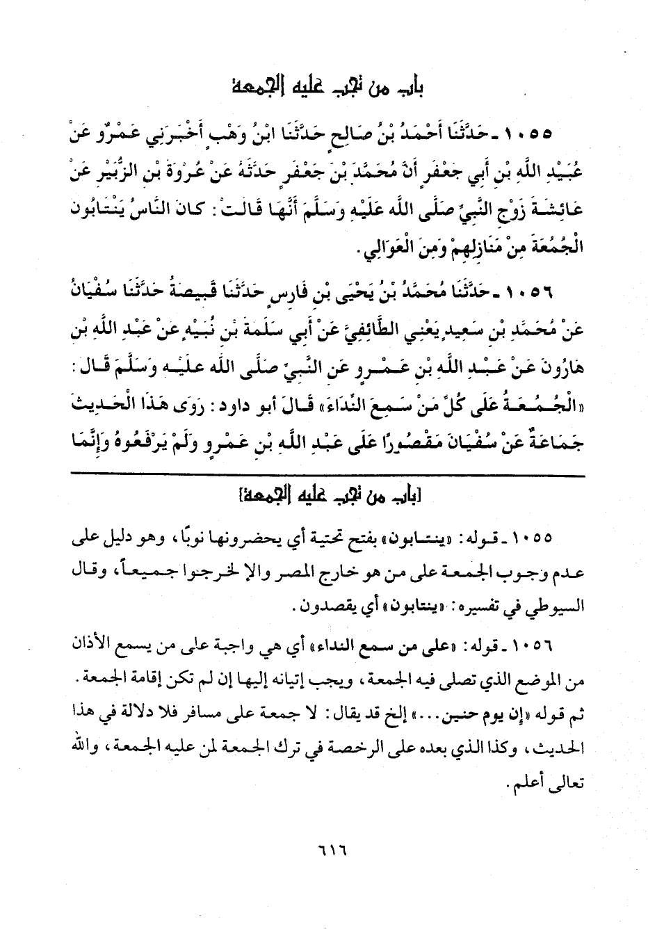 1055 - قوله: "ينتابون" بفتح تحتية أي يحضرونها نوبًا، وهو دليل على عدم وجوب الجمعة على من هو خارج المصر وإلا لخرجوا جميعًا، وقال السيوطي في تفسيره: "ينتابون" أي يقصدون.