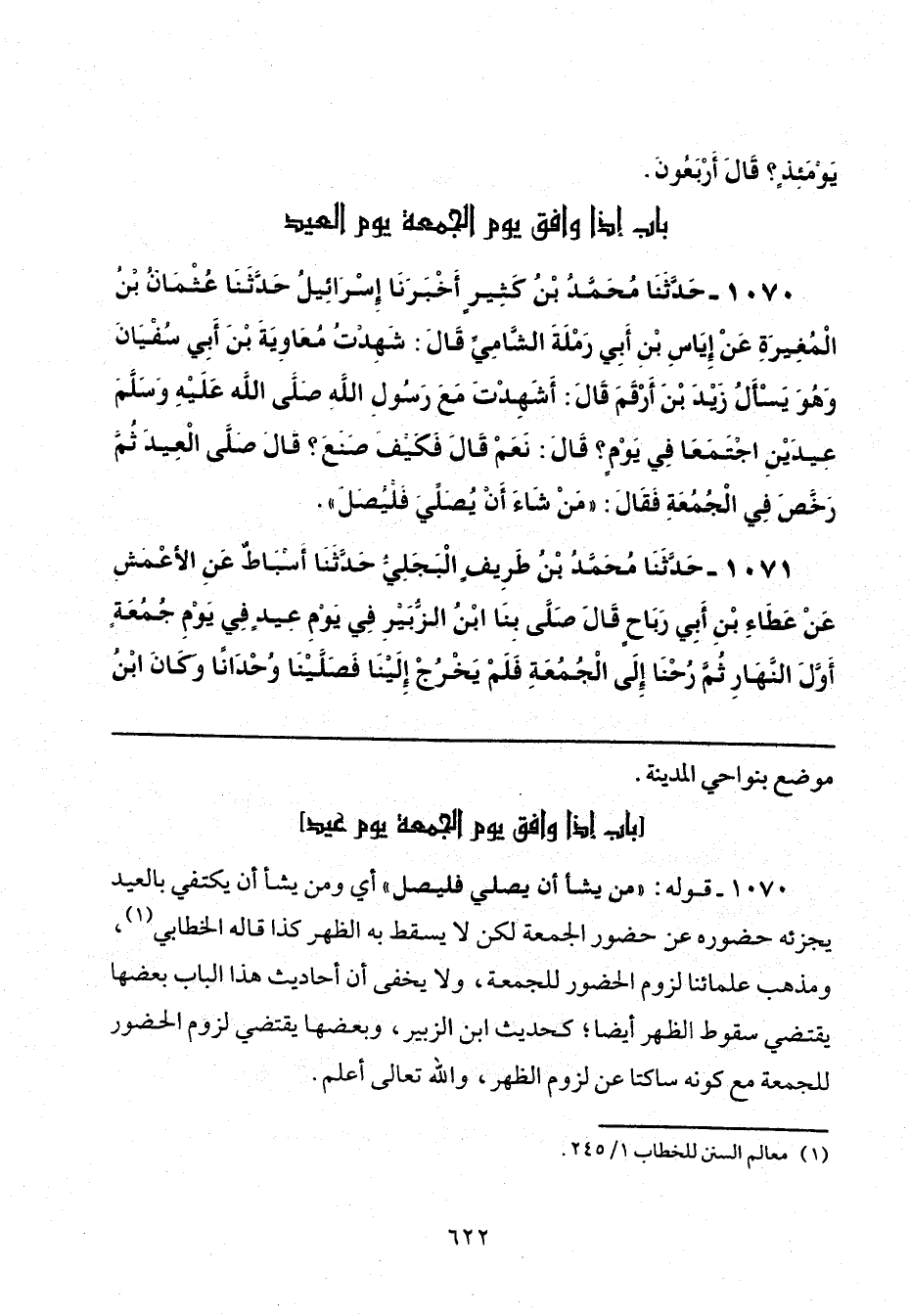 1070 - قوله: "من يشأ أن يصلي فليصل" أي ومن يشأ أن يكتفي بالعيد يجزئه حضوره عن حضور الجمعة لكن لا يسقط به الظهر كذا قاله الخطابي (¬1)، ومذهب علمائنا لزوم الحضور للجمعة، ولا يخفى أن أحاديث هذا الباب بعضها يقتضي سقوط الظهر أيضًا؛ كحديث ابن الزبير، وبعضها يقتضي لزوم الحضور للجمعة مع كونه ساكتا عن لزوم الظهر، والله تعالى أعلم.