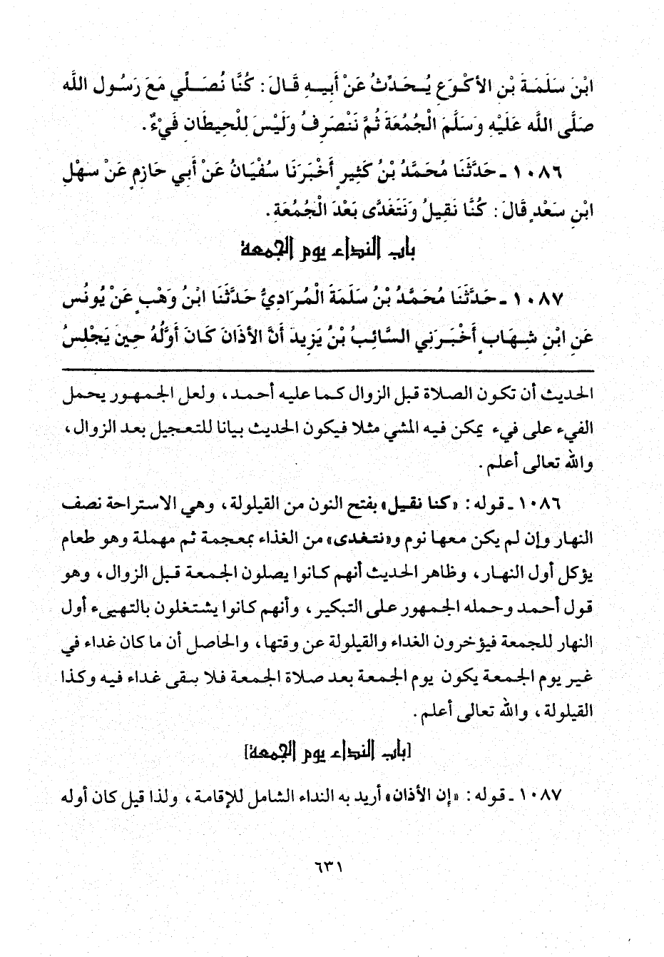 1086 - قوله: "كنا نقيل" بفتح النون من القيلولة، وهي الاستراحة نصف النهار وإن لم يكن معها نوم و"نتغدى" من الغذاء بمعجمة ثم مهملة وهو طعام يؤكل أول النهار، وظاهر الحديث أنهم كانوا يصلون الجمعة قبل الزوال، وهو قول أحمد وحمله الجمهور على التبكير، وأنهم كانوا يشتغلون بالتهيئ أول النهار للجمعة فيؤخرون الغداء والقيلولة عن وقتها، والحاصل أن ما كان غداء في غير يوم الجمعة يكون يوم الجمعة بعد صلاة الجمعة فلا بقى غداء فيه وكذا القيلولة، والله تعالى أعلم.