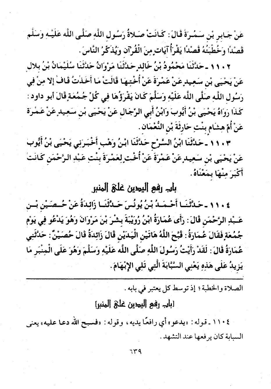 1104 - حَدَّثَنَا أَحْمَدُ بْنُ يُونُسَ، حَدَّثَنَا زَائِدَةُ، عَنْ حُصَيْنِ بْنِ عَبْدِ الرَّحْمَنِ، قَالَ: رَأَى عُمَارَةُ بْنُ رُوَيْبَةَ بِشْرَ بْنَ مَرْوَانَ، وَهُوَ يَدْعُو فِي يَوْمِ جُمُعَةٍ، فَقَالَ عُمَارَةُ: قَبَّحَ اللَّهُ هَاتَيْنِ الْيَدَيْنِ، قَالَ زَائِدَةُ: قَالَ حُصَيْنٌ: حَدَّثَنِي عُمَارَةُ، قَالَ: «لَقَدْ رَأَيْتُ رَسُولَ اللَّهِ صَلَّى اللهُ عَلَيْهِ وَسَلَّمَ، وَهُوَ عَلَى الْمِنْبَرِ مَا يَزِيدُ عَلَى هَذِهِ» يَعْنِي السَّبَّابَةَ الَّتِي تَلِي الْإِبْهَامَ.