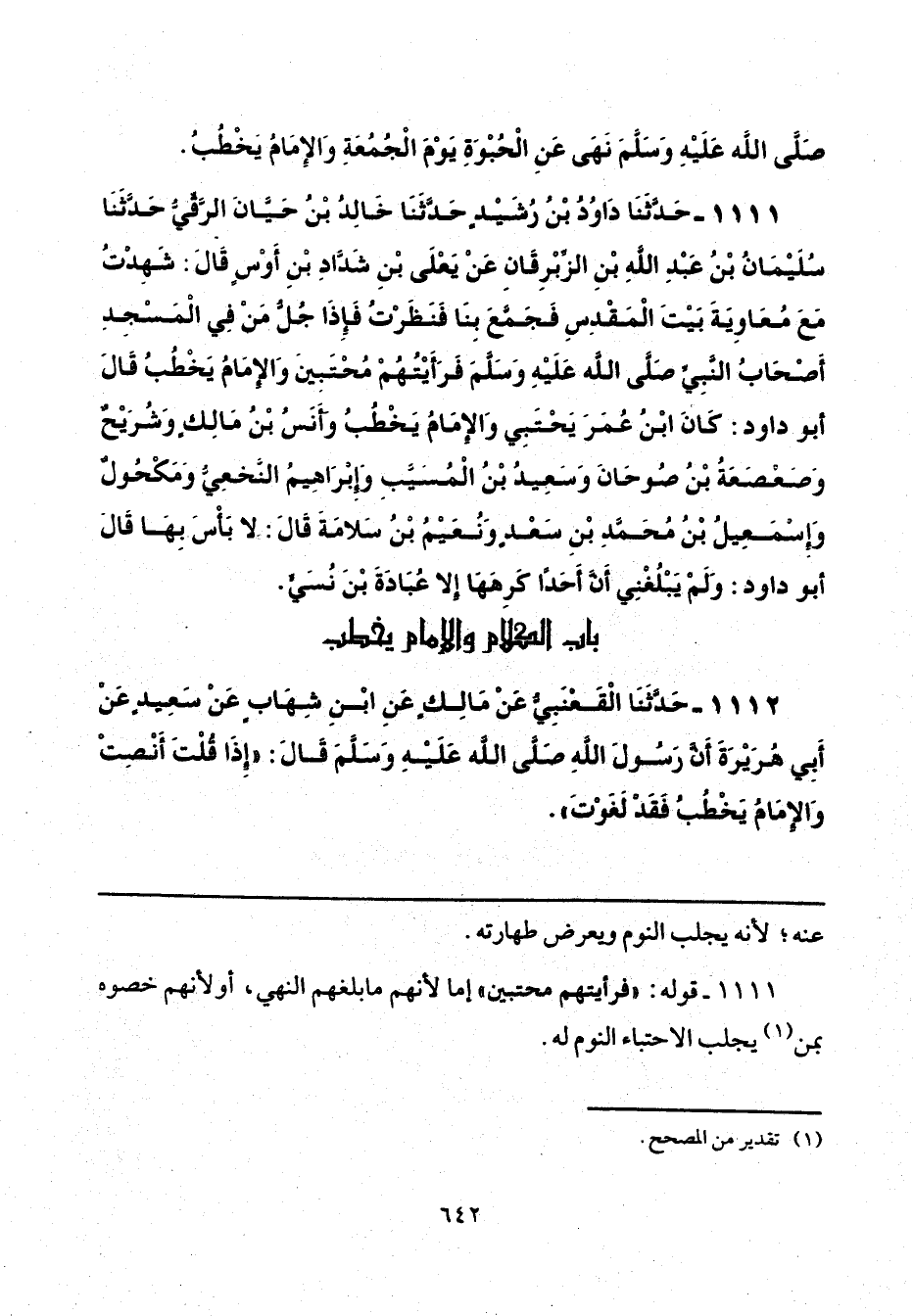 1111 - حَدَّثَنَا دَاوُدُ بْنُ رُشَيْدٍ، حَدَّثَنَا خَالِدُ بْنُ حَيَّانَ الرَّقِّيُّ، حَدَّثَنَا سُلَيْمَانُ بْنُ عَبْدِ اللَّهِ بْنِ الزِّبْرِقَانِ، عَنْ يَعْلَى بْنِ شَدَّادِ بْنِ أَوْسٍ، قَالَ: «شَهِدْتُ مَعَ مُعَاوِيَةَ بَيْتَ الْمَقْدِسِ فَجَمَّعَ بِنَا، فَنَظَرْتُ فَإِذَا جُلُّ مَنْ فِي الْمَسْجِدِ أَصْحَابُ النَّبِيِّ صَلَّى اللهُ عَلَيْهِ وَسَلَّمَ، فَرَأَيْتُهُمْ مُحْتَبِينَ وَالْإِمَامُ يَخْطُبُ»، قَالَ أَبُو دَاوُدَ: «كَانَ ابْنُ عُمَرَ يَحْتَبِي وَالْإِمَامُ يَخْطُبُ، وَأَنَسُ بْنُ مَالِكٍ»، " وَشُرَيْحٌ، وَصَعْصَعَةُ بْنُ صُوحَانَ، وَسَعِيدُ بْنُ الْمُسَيَّبِ، وَإِبْرَاهِيمُ النَّخَعِيُّ، وَمَكْحُولٌ، وَإِسْمَاعِيلُ بْنُ مُحَمَّدِ بْنِ سَعْدٍ، وَنُعَيْمُ بْنُ سَلَامَةَ، قَالَ: لَا بَأْسَ بِهَا "، قَالَ أَبُو دَاوُدَ: «وَلَمْ يَبْلُغْنِي أَنَّ أَحَدًا كَرِهَهَا إِلَّا عُبَادَةَ بْنَ نُسَيٍّ».