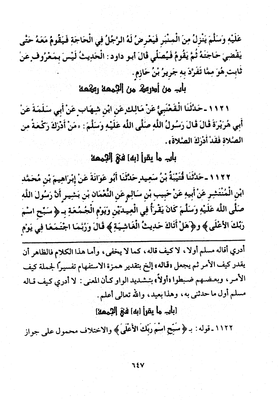 1122 - حَدَّثَنَا قُتَيْبَةُ بْنُ سَعِيدٍ، حَدَّثَنَا أَبُو عَوَانَةَ، عَنْ إِبْرَاهِيمَ بْنِ مُحَمَّدِ بْنِ الْمُنْتَشِرِ، عَنْ أَبِيهِ، عَنْ حَبِيبِ بْنِ سَالِمٍ، عَنِ النُّعْمَانِ بْنِ بَشِيرٍ، " أَنَّ رَسُولَ اللَّهِ صَلَّى اللهُ عَلَيْهِ وَسَلَّمَ كَانَ يَقْرَأُ فِي الْعِيدَيْنِ وَيَوْمِ الْجُمُعَةِ: بِسَبِّحِ اسْمَ رَبِّكَ الْأَعْلَى، وَهَلْ أَتَاكَ حَدِيثُ الْغَاشِيَةِ "، قَالَ: «وَرُبَّمَا اجْتَمَعَا فِي يَوْمٍ