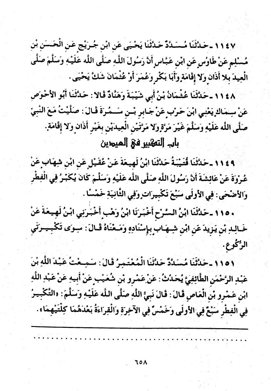 1151 - حَدَّثَنَا مُسَدَّدٌ، حَدَّثَنَا الْمُعْتَمِرُ، قَالَ: سَمِعْتُ عَبْدَ اللَّهِ بْنَ عَبْدِ الرَّحْمَنِ الطَّائِفِيَّ، يُحَدِّثُ عَنْ عَمْرِو بْنِ شُعَيْبٍ، عَنْ أَبِيهِ، عَنْ عَبْدِ اللَّهِ بْنِ عَمْرِو بْنِ الْعَاصِ، قَالَ: قَالَ نَبِيُّ اللَّهِ صَلَّى اللهُ عَلَيْهِ وَسَلَّمَ: «التَّكْبِيرُ فِي الْفِطْرِ سَبْعٌ فِي الْأُولَى، وَخَمْسٌ فِي الْآخِرَةِ، وَالْقِرَاءَةُ بَعْدَهُمَا كِلْتَيْهِمَا».