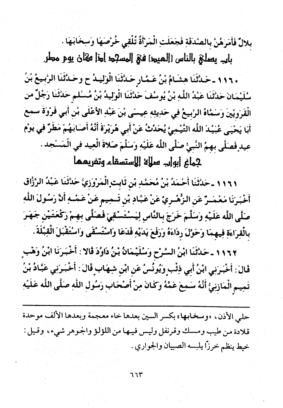 1160 - حَدَّثَنَا هِشَامُ بْنُ عَمَّارٍ، حَدَّثَنَا الْوَلِيدُ، ح وحَدَّثَنَا الرَّبِيعُ بْنُ سُلَيْمَانَ، حَدَّثَنَا عَبْدُ اللَّهِ بْنُ يُوسُفَ، حَدَّثَنَا الْوَلِيدُ بْنُ مُسْلِمٍ، حَدَّثَنَا رَجُلٌ مِنَ الْقَرَوِيِّينَ، وَسَمَّاهُ الرَّبِيعُ فِي حَدِيثِهِ عِيسَى بْنَ عَبْدِ الْأَعْلَى بْنِ أَبِي فَرْوَةَ، سَمِعَ أَبَا يَحْيَى عُبَيْدَ اللَّهِ التَّيْمِيَّ، يُحَدِّثُ عَنْ أَبِي هُرَيْرَةَ، «أَنَّهُ أَصَابَهُمْ مَطَرٌ فِي يَوْمِ عِيدٍ، فَصَلَّى بِهِمُ النَّبِيُّ صَلَّى اللهُ عَلَيْهِ وَسَلَّمَ صَلَاةَ الْعِيدِ فِي الْمَسْجِدِ».
