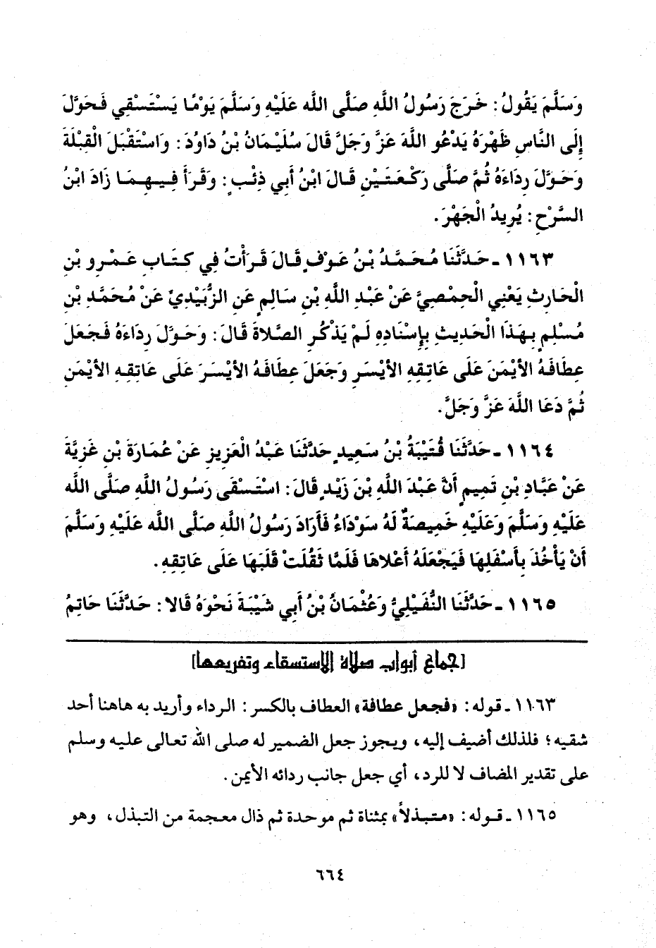 1164 - حَدَّثَنَا قُتَيْبَةُ بْنُ سَعِيدٍ، حَدَّثَنَا عَبْدُ الْعَزِيزِ، عَنْ عُمَارَةَ بْنِ غَزِيَّةَ، عَنْ عَبَّادِ بْنِ تَمِيمٍ، أَنَّ عَبْدَ اللَّهِ بْنَ زَيْدٍ، قَالَ: «اسْتَسْقَى رَسُولُ اللَّهِ صَلَّى اللهُ عَلَيْهِ وَسَلَّمَ وَعَلَيْهِ خَمِيصَةٌ لَهُ سَوْدَاءُ، فَأَرَادَ رَسُولُ اللَّهِ صَلَّى اللهُ عَلَيْهِ وَسَلَّمَ أَنْ يَأْخُذَ بِأَسْفَلِهَا فَيَجْعَلَهُ أَعْلَاهَا، فَلَمَّا ثَقُلَتْ قَلَبَهَا عَلَى عَاتِقِهِ».