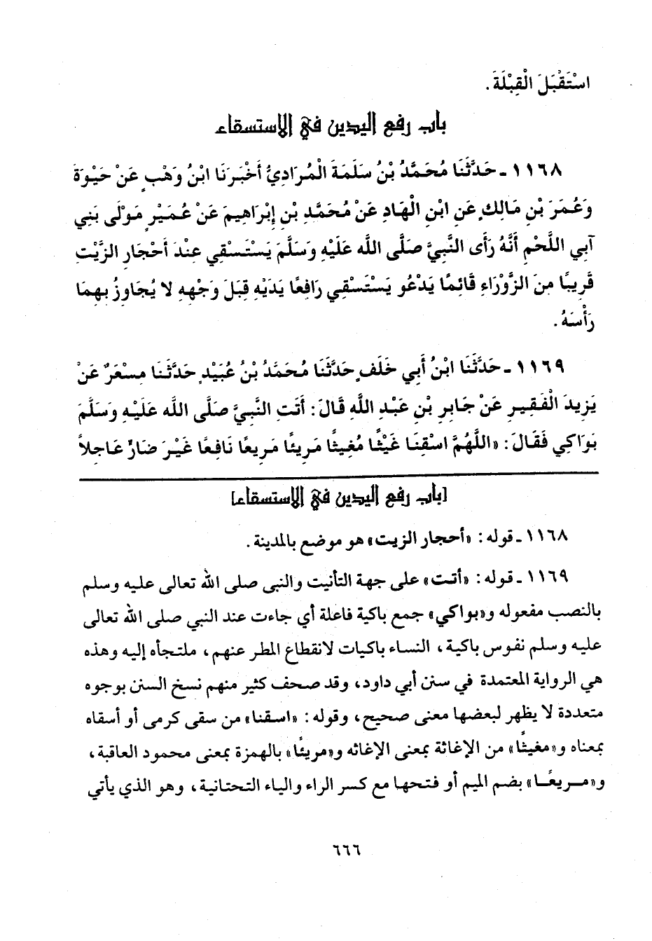 1169 - قوله: "أتت" على جهة التأنيت والنبي صلى الله تعالى عليه وسلم بالنصب مفعوله و"بواكي" جمع باكية فاعلة أي جاءت عند النبي صلى الله تعالى عليه وسلم نفوس باكية، النساء باكيات لانقطاع المطر عنهم، ملتجأه إليه وهذه هي الرواية المعتمدة في سنن أبي داود، وقد صحف كثير منهم نسخ السنن بوجوه معددة لا يظهر بعضها معنى صحيح، وقوله: "اسقنا" من سقى كرمى أو أسقاه بمعناه و"مغيثًا" من الإغاثة بمعنى الإغاثة و"مريئًا" بالهمزة بمعنى محمود العاقبة، و"مريعًا" بضم الميم أو فتحها مع كسر الراء والياء التحتانية، وهو الذي يأتي