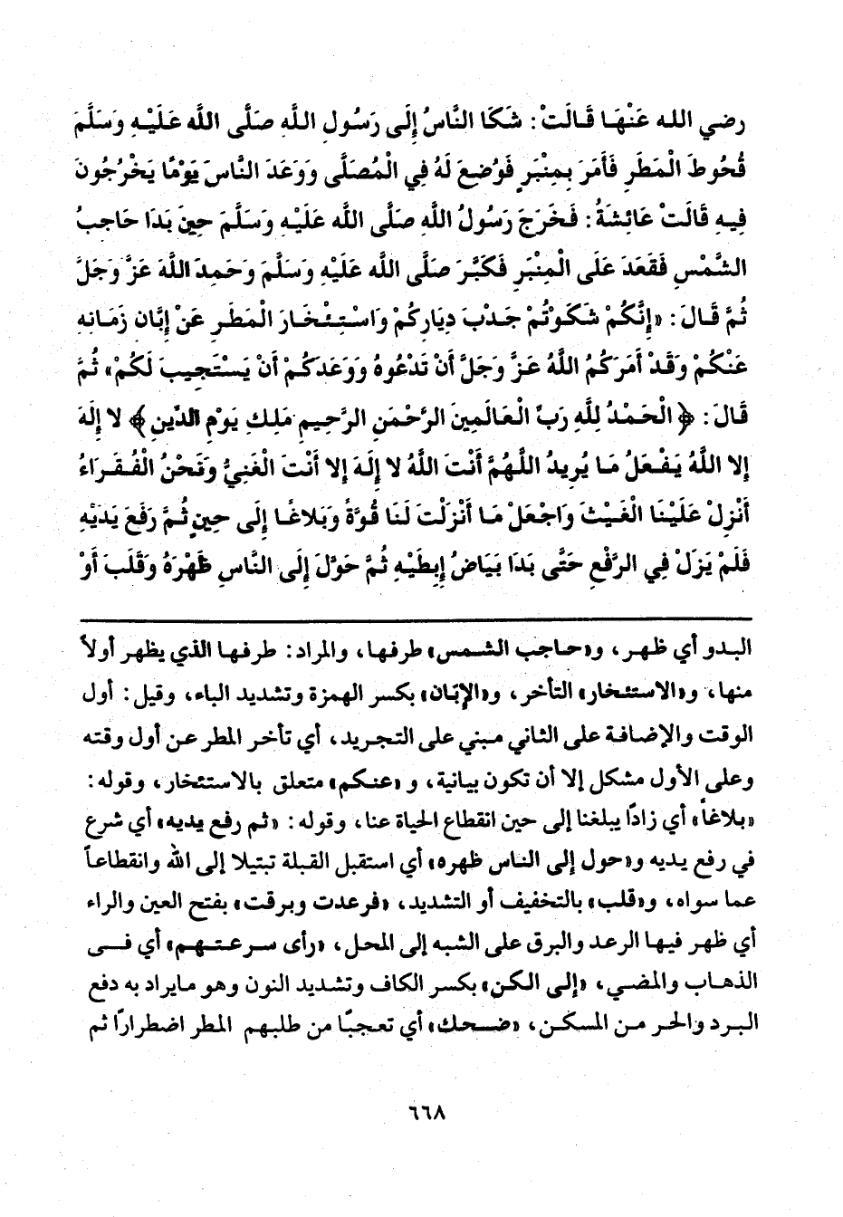 رَضِيَ اللَّهُ عَنْهَا قَالَتْ: شَكَا النَّاسُ إِلَى رَسُولِ اللَّهِ صَلَّى اللهُ عَلَيْهِ وَسَلَّمَ قُحُوطَ الْمَطَرِ، فَأَمَرَ بِمِنْبَرٍ، فَوُضِعَ لَهُ فِي الْمُصَلَّى، وَوَعَدَ النَّاسَ يَوْمًا يَخْرُجُونَ فِيهِ، قَالَتْ عَائِشَةُ: فَخَرَجَ رَسُولُ اللَّهِ صَلَّى اللهُ عَلَيْهِ وَسَلَّمَ، حِينَ بَدَا حَاجِبُ الشَّمْسِ، فَقَعَدَ عَلَى الْمِنْبَرِ، فَكَبَّرَ صَلَّى اللهُ عَلَيْهِ وَسَلَّمَ، وَحَمِدَ اللَّهَ عَزَّ وَجَلَّ، ثُمَّ قَالَ: «إِنَّكُمْ شَكَوْتُمْ جَدْبَ دِيَارِكُمْ، وَاسْتِئْخَارَ الْمَطَرِ عَنْ إِبَّانِ زَمَانِهِ عَنْكُمْ، وَقَدْ أَمَرَكُمُ اللَّهُ عَزَّ وَجَلَّ أَنْ تَدْعُوهُ، وَوَعَدَكُمْ أَنْ يَسْتَجِيبَ لَكُمْ»، ثُمَّ قَالَ: «الْحَمْدُ لِلَّهِ رَبِّ الْعَالَمِينَ الرَّحْمَنِ الرَّحِيمِ مَلِكِ يَوْمِ الدِّينِ، لَا إِلَهَ إِلَّا اللَّهُ، يَفْعَلُ مَا يُرِيدُ، اللَّهُمَّ أَنْتَ اللَّهُ، لَا إِلَهَ إِلَّا أَنْتَ الْغَنِيُّ وَنَحْنُ الْفُقَرَاءُ، أَنْزِلْ عَلَيْنَا الْغَيْثَ، وَاجْعَلْ مَا أَنْزَلْتَ لَنَا قُوَّةً وَبَلَاغًا إِلَى حِينٍ»، ثُمَّ رَفَعَ يَدَيْهِ، فَلَمْ يَزَلْ فِي الرَّفْعِ حَتَّى بَدَا بَيَاضُ إِبِطَيْهِ، ثُمَّ حَوَّلَ إِلَى النَّاسِ ظَهْرَهُ، وَقَلَبَ، أَوْ