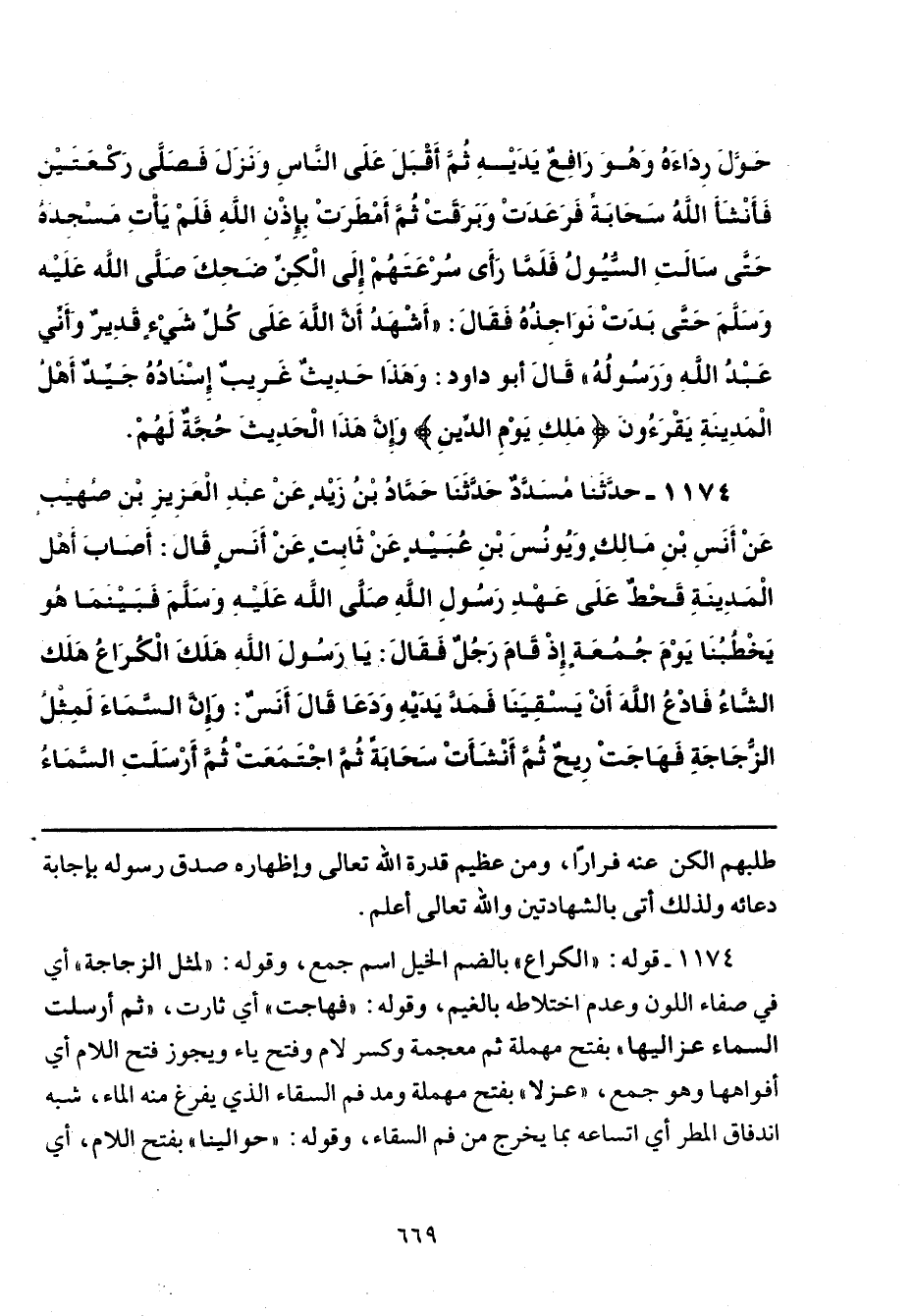 1174 - حَدَّثَنَا مُسَدَّدٌ، حَدَّثَنَا حَمَّادُ بْنُ زَيْدٍ، عَنْ عَبْدِ الْعَزِيزِ بْنِ صُهَيْبٍ، عَنْ أَنَسِ بْنِ مَالِكٍ، وَيُونُسَ بْنِ عُبَيْدٍ، عَنْ ثَابِتٍ، عَنْ أَنَسٍ، قَالَ: أَصَابَ أَهْلَ الْمَدِينَةِ قَحْطٌ عَلَى عَهْدِ رَسُولِ اللَّهِ صَلَّى اللهُ عَلَيْهِ وَسَلَّمَ، فَبَيْنَمَا هُوَ يَخْطُبُنَا يَوْمَ جُمُعَةٍ، إِذْ قَامَ رَجُلٌ، فَقَالَ: يَا رَسُولَ اللَّهِ، هَلَكَ الْكُرَاعُ، هَلَكَ الشَّاءُ، فَادْعُ اللَّهَ أَنْ يَسْقِيَنَا، فَمَدَّ يَدَيْهِ وَدَعَا، قَالَ أَنَسٌ: وَإِنَّ السَّمَاءَ لَمِثْلُ الزُّجَاجَةِ، فَهَاجَتْ رِيحٌ، ثُمَّ أَنْشَأَتْ سَحَابَةً، ثُمَّ اجْتَمَعَتْ، ثُمَّ أَرْسَلَتِ السَّمَاءُ