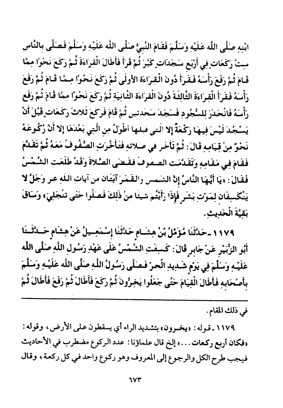 1179 - حَدَّثَنَا مُؤَمَّلُ بْنُ هِشَامٍ، حَدَّثَنَا إِسْمَاعِيلُ، عَنْ هِشَامٍ، حَدَّثَنَا أَبُو الزُّبَيْرِ، عَنْ جَابِرٍ، قَالَ: كُسِفَتِ الشَّمْسُ عَلَى عَهْدِ رَسُولِ اللَّهِ صَلَّى اللهُ عَلَيْهِ وَسَلَّمَ فِي يَوْمٍ شَدِيدِ الْحَرِّ، فَصَلَّى رَسُولُ اللَّهِ صَلَّى اللهُ عَلَيْهِ وَسَلَّمَ بِأَصْحَابِهِ، فَأَطَالَ الْقِيَامَ حَتَّى جَعَلُوا يَخِرُّونَ، ثُمَّ رَكَعَ فَأَطَالَ، ثُمَّ رَفَعَ فَأَطَالَ، ثُمَّ