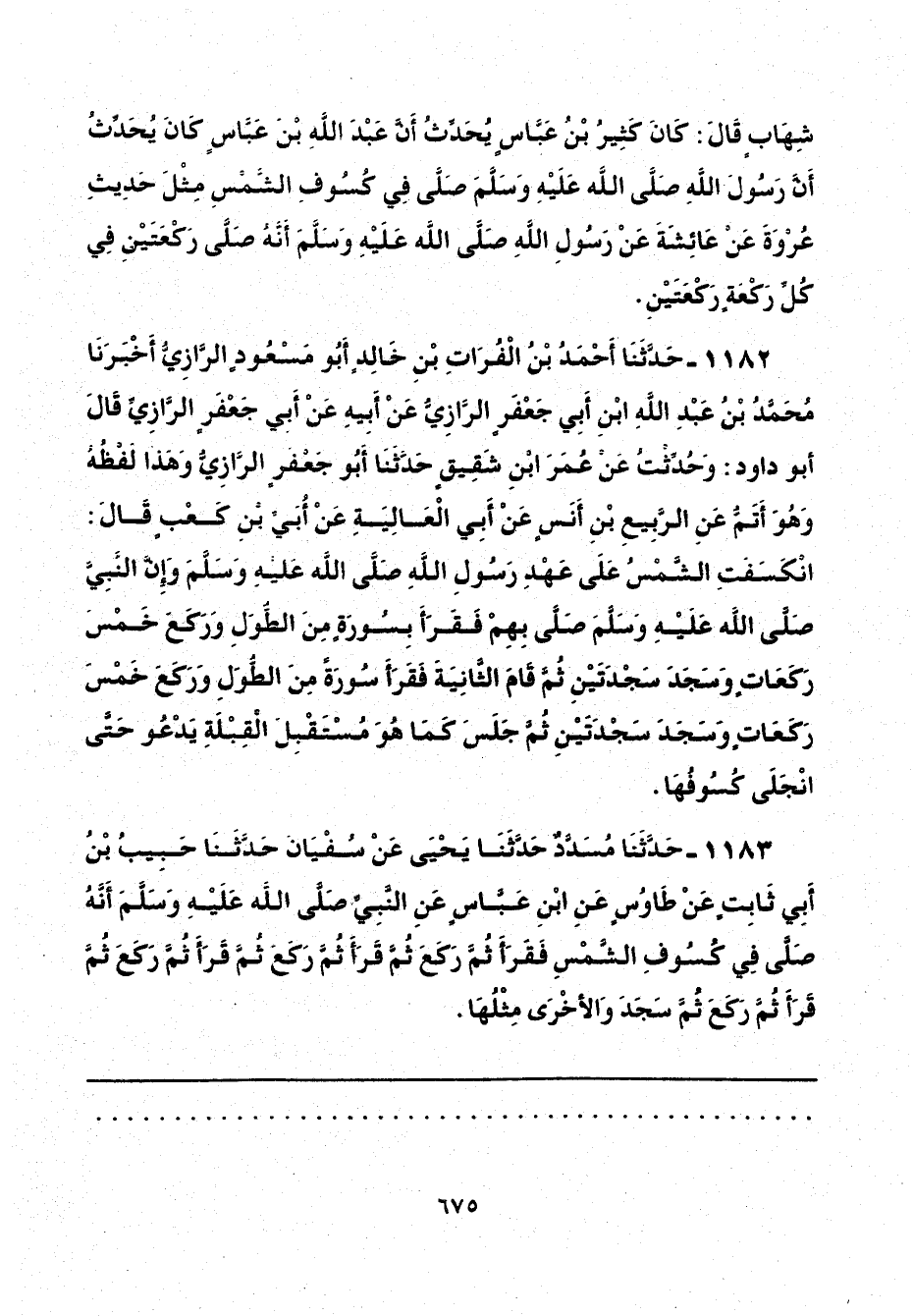 1183 - حَدَّثَنَا مُسَدَّدٌ، حَدَّثَنَا يَحْيَى، عَنْ سُفْيَانَ، حَدَّثَنَا حَبِيبُ بْنُ أَبِي ثَابِتٍ، عَنْ طَاوُسٍ، عَنِ ابْنِ عَبَّاسٍ، عَنِ النَّبِيِّ صَلَّى اللهُ عَلَيْهِ وَسَلَّمَ، «أَنَّهُ صَلَّى فِي كُسُوفِ الشَّمْسِ، فَقَرَأَ، ثُمَّ رَكَعَ، ثُمَّ قَرَأَ، ثُمَّ رَكَعَ، ثُمَّ قَرَأَ، ثُمَّ رَكَعَ، ثُمَّ قَرَأَ، ثُمَّ رَكَعَ، ثُمَّ سَجَدَ وَالْأُخْرَى مِثْلُهَا».