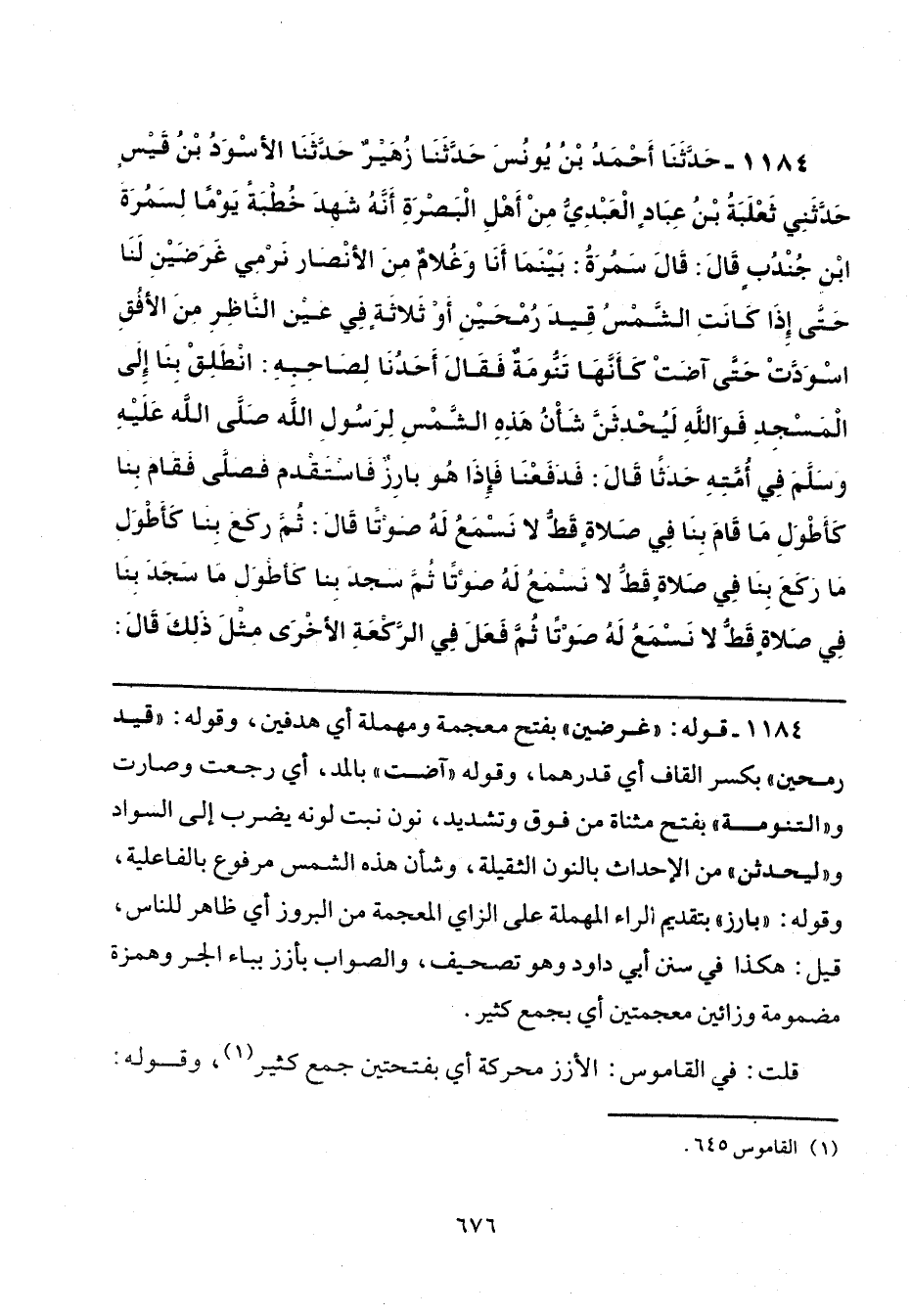 1184 - قوله: "غرضين" بفتح معجمة ومهملة أي هدفين، وقوله: "قيد رمحين" بكسر القاف أي قدرهما، وقوله "آضت" بالمد، أي رجعت وصارت و"التنومة" بفتح مثناة من فوق وتشديد، نون نبت لونه يضرب إلى السواد و"ليحدثن" من الإحداث بالنون الثقيلة، وشأن هذه الشمس مرفوع بالفاعلية، وقوله: "بارز" بتقديم الراء المهملة على الزاي المعجمة من البروز أي ظاهر للناس، قيل: هكذا في سنن أبي داود وهو تصحيف، والصواب بأزز بباء الجر وهمزة مضمومة وزائين معجمتين أي بجمع كثير.