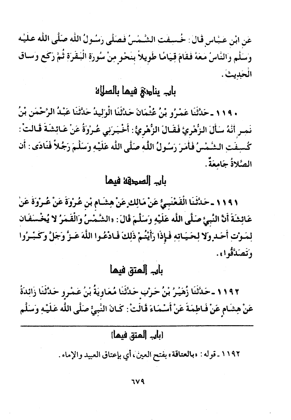1190 - حَدَّثَنَا عَمْرُو بْنُ عُثْمَانَ، حَدَّثَنَا الْوَلِيدُ، حَدَّثَنَا عَبْدُ الرَّحْمَنِ بْنُ نَمِرٍ، أَنَّهُ سَأَلَ الزُّهْرِيَّ، فَقَالَ الزُّهْرِيُّ: أَخْبَرَنِي عُرْوَةُ، عَنْ عَائِشَةَ، قَالَتْ: كُسِفَتِ الشَّمْسُ، فَأَمَرَ رَسُولُ اللَّهِ صَلَّى اللهُ عَلَيْهِ وَسَلَّمَ رَجُلًا فَنَادَى: أَنِ الصَّلَاةُ جَامِعَةٌ.