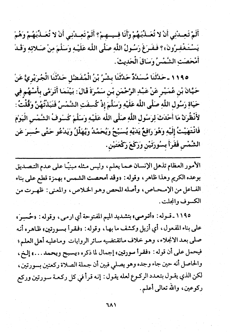 1195 - قوله: "أترمى" بتشديد الميم المفتوحة أي ارمى، وقوله: "حُسِرَ" على بناء المفعول، أي أزيل وكشف ما بها، وقوله: "فقرأ بسورتين" ظاهره أنه صلى بعد الانجلاء، وهو خلاف ما تقتضيه سائر الروايات وما عليه أهل العلم، فيحمل على أن قوله. "فقرأ سورتين" إجمال لما ذكره "يسبح ويحمد. . ." إلخ، والحاصل أنه حين جاء وجده وهو يصلي فبين أن جملة الصلاة ركعتين بسورتين، لكن الذي يقول بعدد الركوع لعله يقول: إنه قرأ في كل ركعة سورتين وركع ركوعين، والله تعالى أعلم.