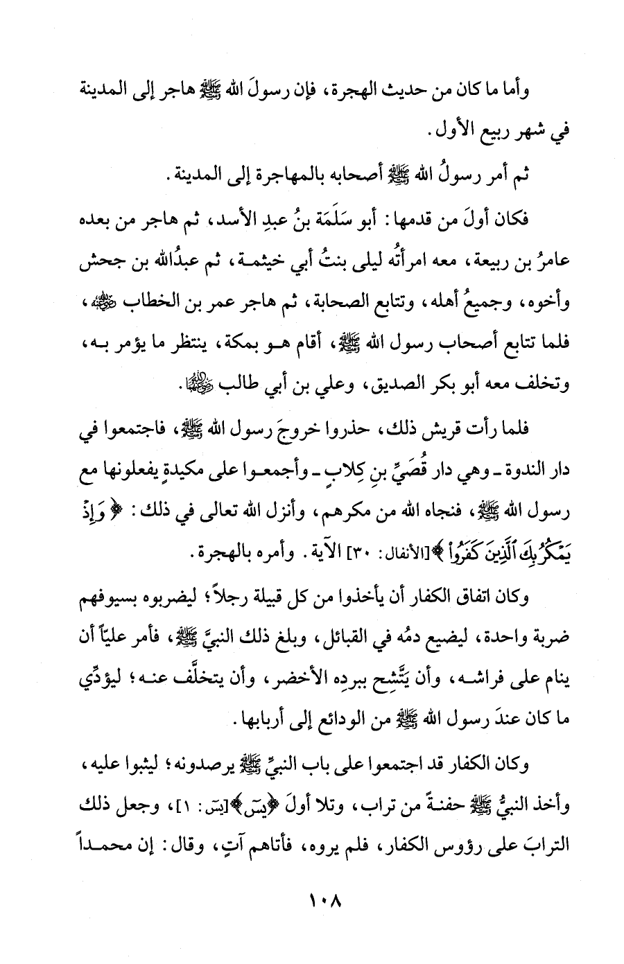 فلما رأت قريش ذلك، حذروا خروجَ رسول الله - صلى الله عليه وسلم -، فاجتمعوا في دار الندوة - وهي دار قُصَيِّ بنِ كِلابٍ - وأجمعوا على مكيدةٍ يفعلونها مع رسول الله - صلى الله عليه وسلم -، فنجاه الله من مكرهم، وأنزل الله تعالى في ذلك: {وَإِذْ يَمْكُرُ بِكَ الَّذِينَ كَفَرُوا} [الأنفال: 30] الآية. وأمره بالهجرة.