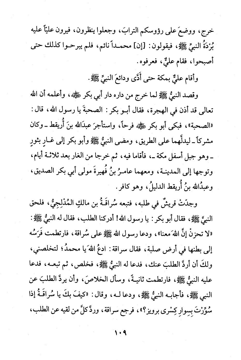 وجدّتْ قريشٌ في طلبه، فتبعه سُراقَةُ بن مالكٍ المُدْلِجِيُّ، فلحق النبيَّ - صلى الله عليه وسلم -، فقال أبو بكر: يا رسول الله! أدركنا الطلب، فقال له النبيّ - صلى الله عليه وسلم -: "لا تحزنْ إنَّ اللهَ معنا"، ودعا رسول الله - صلى الله عليه وسلم - على سُراقة، فارتطمت فَرَسُه إلى بطنها في أرض صلبة، فقال سراقة: ادعُ اللهَ يا محمدُ؛ لتخلصني، ولكَ أن أردَّ الطلبَ عنك، فدعا له النبيّ - صلى الله عليه وسلم -، فخلص، ثم تبعه، فدعا عليه النبيُّ - صلى الله عليه وسلم -، فارتطمت ثانية، وسأل الخلاصَ، وأن يردَّ الطلبَ عن النبي - صلى الله عليه وسلم -، فأجابه النبيِّ - صلى الله عليه وسلم -، ودعا له، وقال: "كيفَ بكَ يا سُراقَةُ إذا سُوِّرْتَ بِسِوارِ كِسْرى برويز؟ "، فرجع سراقة، وردَّ كلَّ من لقيه عن الطلب،