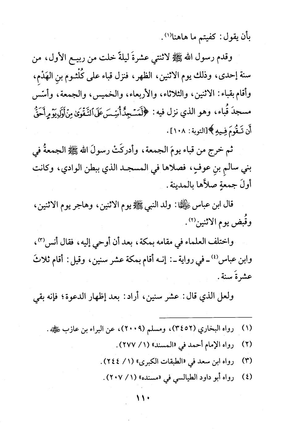 وقدم رسول الله - صلى الله عليه وسلم - لاثنتي عشرةَ ليلةً خلت من ربيع الأول، من سنة إحدى، وذلك يوم الاثنين، الظهر، فنزل قباء على كُلْثوم بنِ الهَدْمِ، وأقام بقباء: الاثنين، والثلاثاء، والأربعاء، والخميس، والجمعة، وأسّس مسجدَ قُباء، وهو الذي نزل فيه: {لَا تَقُمْ فِيهِ أَبَدًا لَمَسْجِدٌ أُسِّسَ عَلَى التَّقْوَى مِنْ أَوَّلِ يَوْمٍ أَحَقُّ أَنْ تَقُومَ فِيهِ} [التوبة: 108].