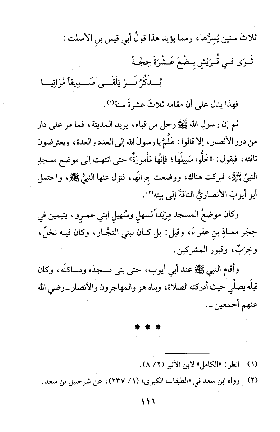 وأقام النبي - صلى الله عليه وسلم - عند أبي أيوب، حتى بنى مسجدَه ومساكنَه، وكان قبلَه يصلِّي حيث أدركته الصلاة، ويناه هو والمهاجرون والأنصار - رضي الله عنهم أجمعين -.