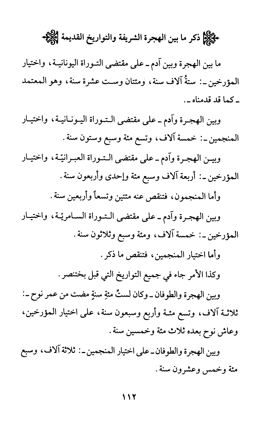 ما بين الهجرة وبين آدم - على مقتضى التوراة اليونانية، واختيار المؤرخين -: ستةُ آلاف سنة، ومئتان وست عشرة سنة، وهو المعتمد - كما قد قدمناه -.