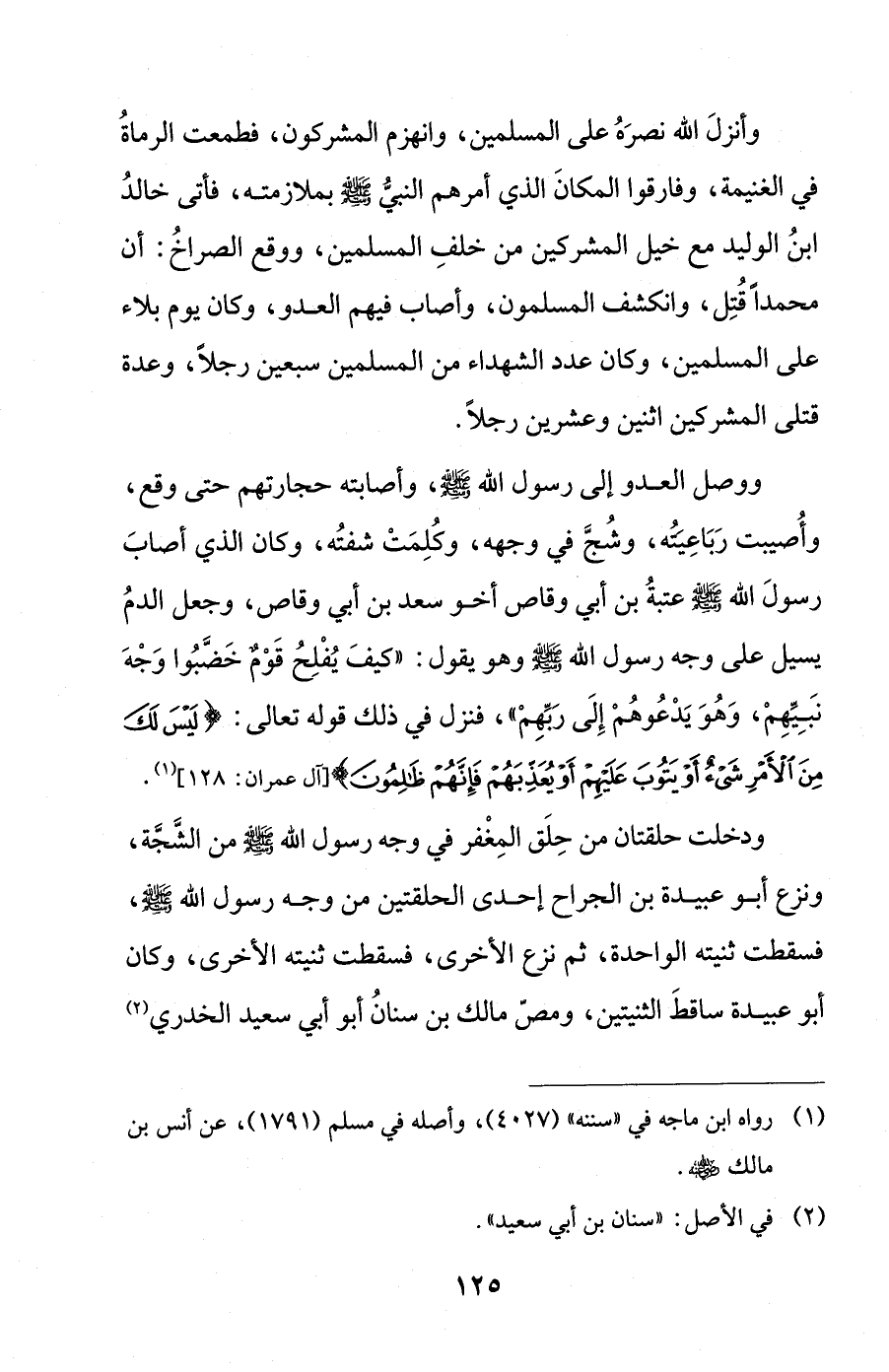 ودخلت حلقتان من حِلَق المِغْفر في وجه رسول الله - صلى الله عليه وسلم - من الشَّجَّة، ونزع أبو عبيدة بن الجراح إحدى الحلقتين من وجه رسول الله - صلى الله عليه وسلم -، فسقطت ثنيته الواحدة، ثم نزع الأخرى، فسقطت ثنيته الأخرى، وكان أبو عبيدة ساقطَ الثنيتين، ومصّ مالك بن سنانُ أبو أبي سعيد الخدري (¬2)
