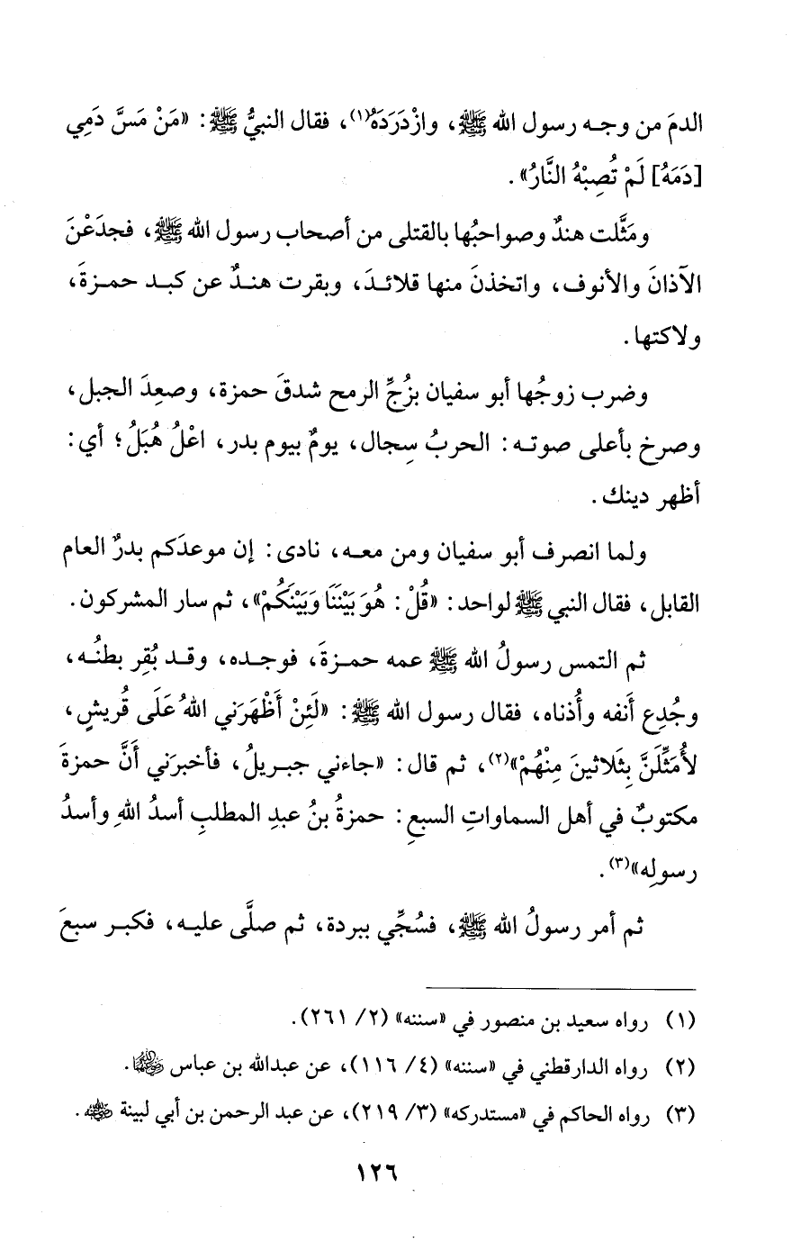 ثم التمس رسولُ الله - صلى الله عليه وسلم - عمه حمزةَ، فوجده، وقد بُقِر بطنُه، وجُدِع أَنفه وأُذناه، فقال رسول الله - صلى الله عليه وسلم -: "لَئِنْ أَظْهَرَني الله عَلَى قُريشٍ، لأُمَثِّلَنَّ بِثَلاثينَ مِنْهُمْ" (¬2)، ثم قال: "جاءني جبريلُ، فأخبرَني أَنَّ حمزةَ مكتوبٌ في أهل السماواتِ السبعِ: حمزةُ بنُ عبدِ المطلبِ أسدُ الله وأسدُ رسولِه" (¬3).
