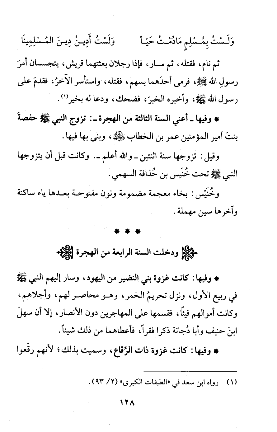 * وفيها - أعني السنة الثالثة من الهجرة -: تزوج النبي - صلى الله عليه وسلم - حفصةَ بنتَ أمير المؤمنين عمر بن الخطاب - رضي الله عنهما -، وبنى بها فيها.