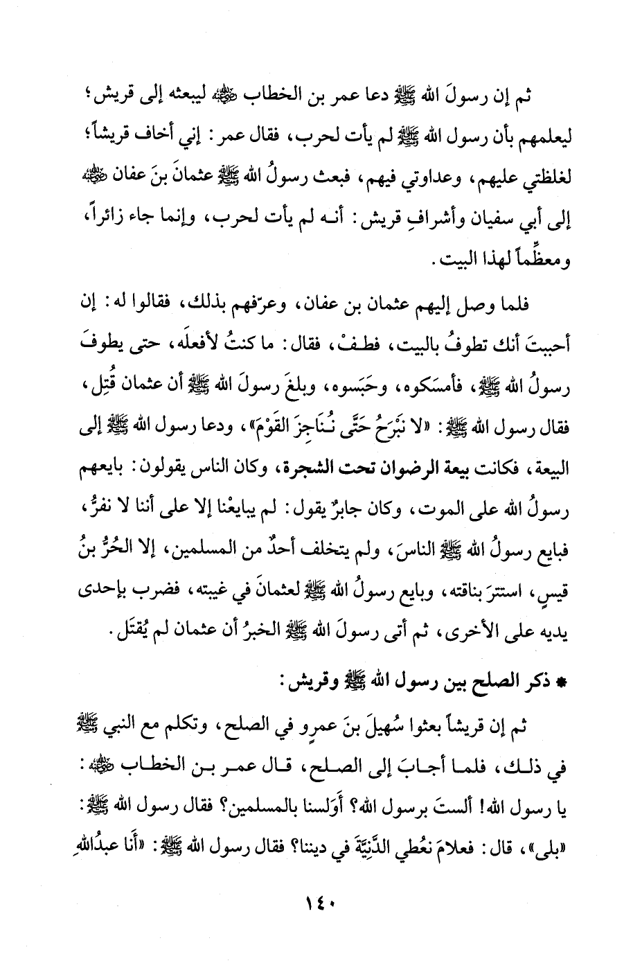 ثم إن رسولَ الله - صلى الله عليه وسلم - دعا عمر بن الخطاب - رضي الله عنه - ليبعثه إلى قريش؛ ليعلمهم بأن رسول الله - صلى الله عليه وسلم - لم يأت لحرب، فقال عمر: إني أخاف قريشًا؛ لغلظتي عليهم، وعداوتي فيهم، فبعث رسولُ الله - صلى الله عليه وسلم - عثمانَ بنَ عفان - رضي الله عنه - إلى أبي سفيان وأشرافِ قريش: أنه لم يأت لحرب، وإنما جاء زائرًا، ومعظِّمًا لهذا البيت.
