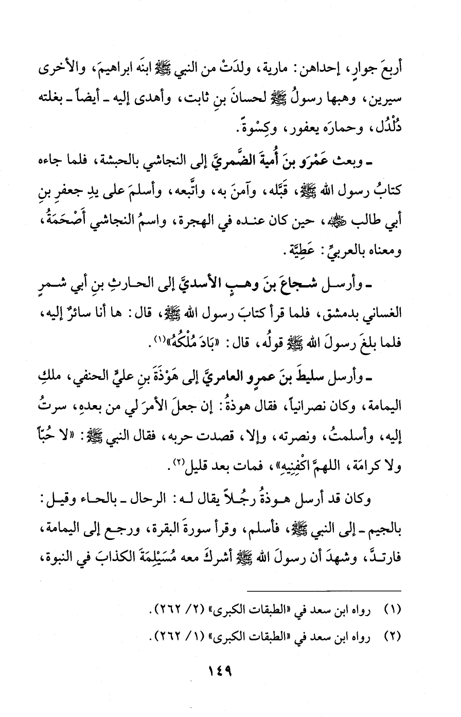 - وأرسل سليطَ بنَ عمرٍو العامريَّ إلى هَوْذَةَ بنِ عليٍّ الحنفي، ملكِ اليمامة، وكان نصرانيًا، فقال هوذةُ: إن جعلَ الأمرَ لي من بعدهِ، سرتُ إليه، وأسلمتُ، ونصرته، وإلا، قصدت حربه، فقال النبي - صلى الله عليه وسلم -: "لا حُبًّا ولا كرامَة، اللهمَّ اكْفِنِيهِ"، فمات بعد قليل (¬2).