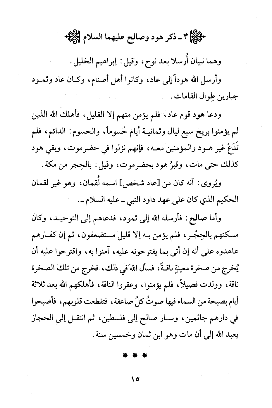 وأما صالح: فأرسله الله إلى ثمود، فدعاهم إلى التوحيد، وكان مسكنهم بالحِجْر، فلم يؤمن به إلا قليل مستضعفون، ثم إن كفارهم عاهدوه على أنه إن أتى بما يقترحونه عليه، آمنوا به، واقترحوا عليه أن يُخرج من صخرة معينةٍ ناقةً، فسأل اللهَ في ذلك، فخرج من تلك الصخرة ناقة، وولدت فصيلاً، فلم يؤمنوا، وعقروا الناقة، فأهلكهم الله بعد ثلاثة أيام بصيحة من السماء فيها صوتُ كلِّ صاعقة، فتقطعت قلوبهم، فأصبحوا في دارهم جاثمين، وسار صالح إلى فلسطين، ثم انتقل إلى الحجاز يعبد الله إلى أن مات وهو ابن ثمان وخمسين سنة.