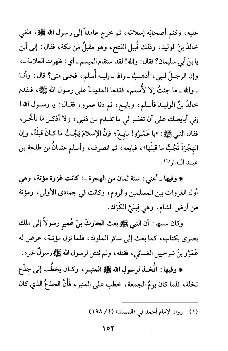عليه، وكتم أصحابَه إسلامَه، ثم خرج عامدًا إلى رسول الله - صلى الله عليه وسلم -، فلقي خالدَ بنَ الوليد، وذلك قُبيل الفتح، وهو مقبلٌ من مكة، فقال: إلى أين يا بنَ أبي سليمان؟ فقال: والله! لقد استقام الميسم - أي: ظهرت العلامة -، وإن الرجلَ لنبي، أذهبُ - والله - إليه أُسلم، فحتى متى؟ قال: وأنا - والله - ما جئتُ إلا لأُسلم، فقدما المدينةَ على رسول الله - صلى الله عليه وسلم -، فتقدم خالدُ بنُ الوليد فأسلم، وبايع، ثم دنا عمرو، فقال: يا رسول الله! إني أبايعك على أن تغفر لي ما تقدم من ذنبي، ولا أذكر ما تأخَّر، فقال النبي - صلى الله عليه وسلم -: "يا عَمْرُو! بايِعْ؛ فإنَّ الإسلامَ يَجُبُّ ما كانَ قبلَهُ، وإن الهِجْرَةَ تَجُبُّ ما قبلَها"، فبايعه، ثم انصرف، وأسلم عثمانُ بن طلحة بن عبد الدار (¬1).