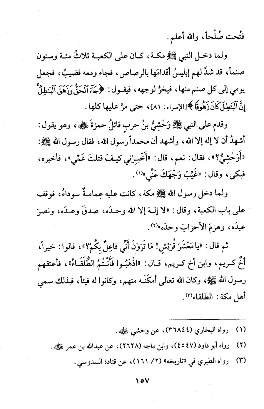 ثم قال: "يا مَعْشَرَ قُرَيْشٍ! مَا تَرَوْنَ أَنِّي فاعِلٌ بِكُمْ؟ "، قالوا: خيرًا، أخٌ كريم، وابن أخ كريم، قال: "اذْهَبُوا فَأَنْتُمُ الطُّلَقَاءُ"، فأعتقهم رسول الله - صلى الله عليه وسلم -، وكان الله تعالى أمكَنَه منهم، وكانوا له فيئًا، فبذلك سمي أهل مكة: الطلقاء (¬3).