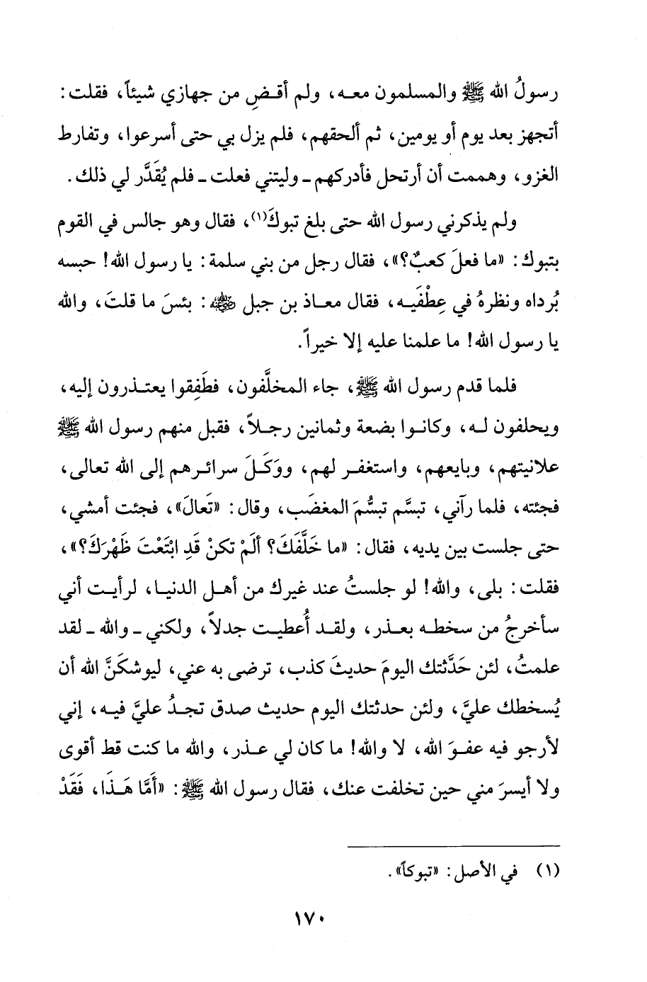 فلما قدم رسول الله - صلى الله عليه وسلم -، جاء المخلَّفون، فطَفِقوا يعتذرون إليه، ويحلفون له، وكانوا بضعة وثمانين رجلًا، فقبل منهم رسول الله - صلى الله عليه وسلم - علانيتهم، وبايعهم، واستغفر لهم، ووَكَلَ سرائرهم إلى الله تعالى، فجئته، فلما رآني، تبسَّم تبسُّمَ المغضَب، وقال: "تَعالَ"، فجئت أمشي، حتى جلست بين يديه، فقال: "ما خَلَّفَكَ؟ أَلَمْ تكنْ قَدِ ابْتَعْتَ ظَهْرَكَ؟ "، فقلت: بلى، والله! لو جلستُ عند غيرك من أهل الدنيا، لرأيت أني سأخرجُ من سخطه بعذر، ولقد أُعطيت جدلًا، ولكني - والله - لقد علمتُ، لئن حَدَّثتك اليومَ حديثَ كذب، ترضى به عني، ليوشكَنَّ الله أن يُسخطك عليَّ، ولئن حدثتك اليوم حديث صدق تجدُ عليَّ فيه، إني لأرجو فيه عفوَ الله، لا والله! ما كان لي عذر، والله ما كنت قط أقوى ولا أيسرَ مني حين تخلفت عنك، فقال رسول الله - صلى الله عليه وسلم -: "أَمَّا هَذَا، فَقَدْ