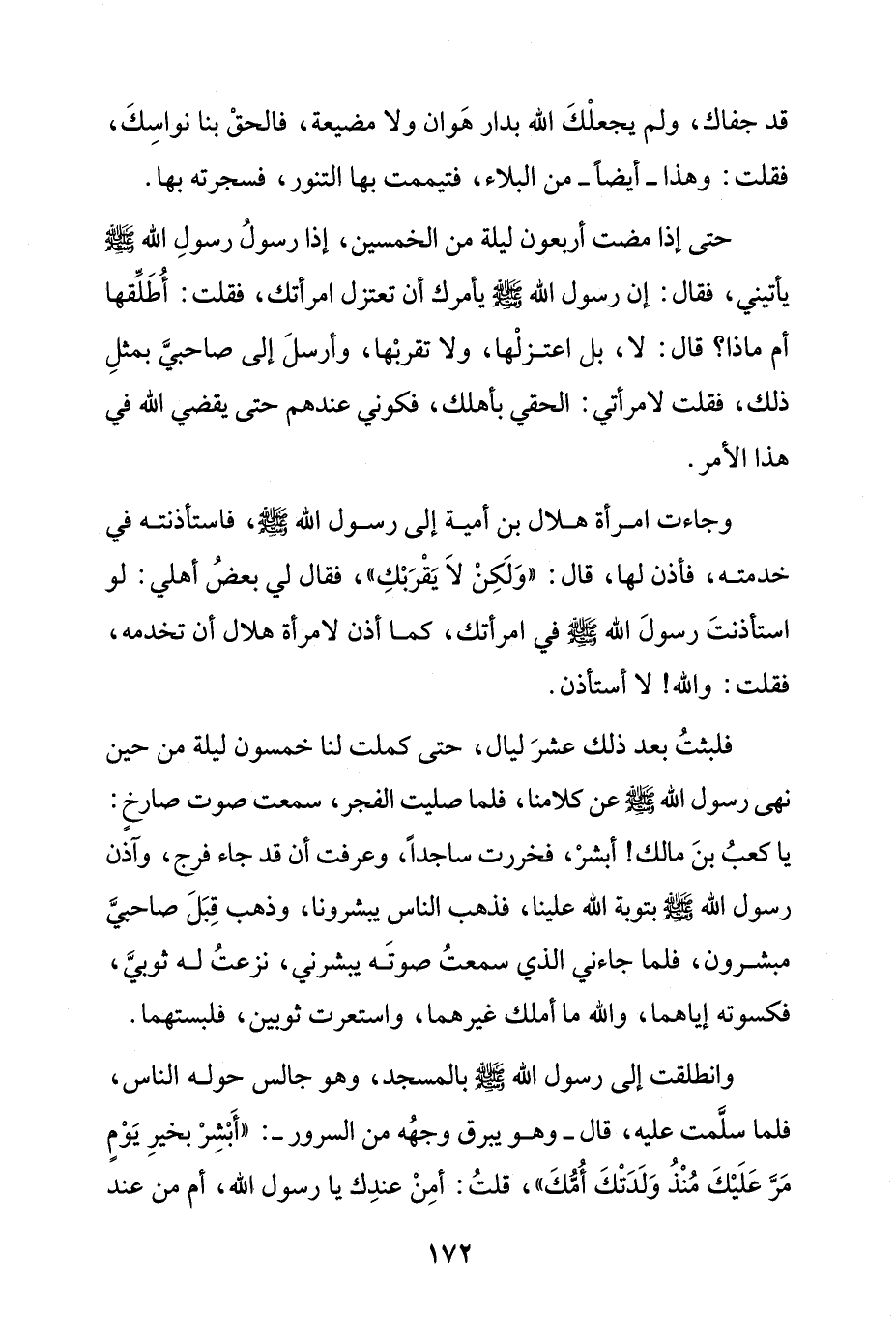 فلبثتُ بعد ذلك عشرَ ليال، حتى كملت لنا خمسون ليلة من حين نهى رسول الله - صلى الله عليه وسلم - عن كلامنا، فلما صليت الفجر، سمعت صوت صارخٍ: يا كعبُ بنَ مالك! أبشرْ، فخررت ساجدًا، وعرفت أن قد جاء فرج، وآذن رسول الله - صلى الله عليه وسلم - بتوبة الله علينا، فذهب الناس يبشرونا، وذهب قِبَلَ صاحبيَّ مبشرون، فلما جاءني الذي سمعتُ صوتَه يبشرني، نزعتُ له ثوبيَّ، فكسوته إياهما، والله ما أملك غيرهما، واستعرت ثوبين، فلبستهما.