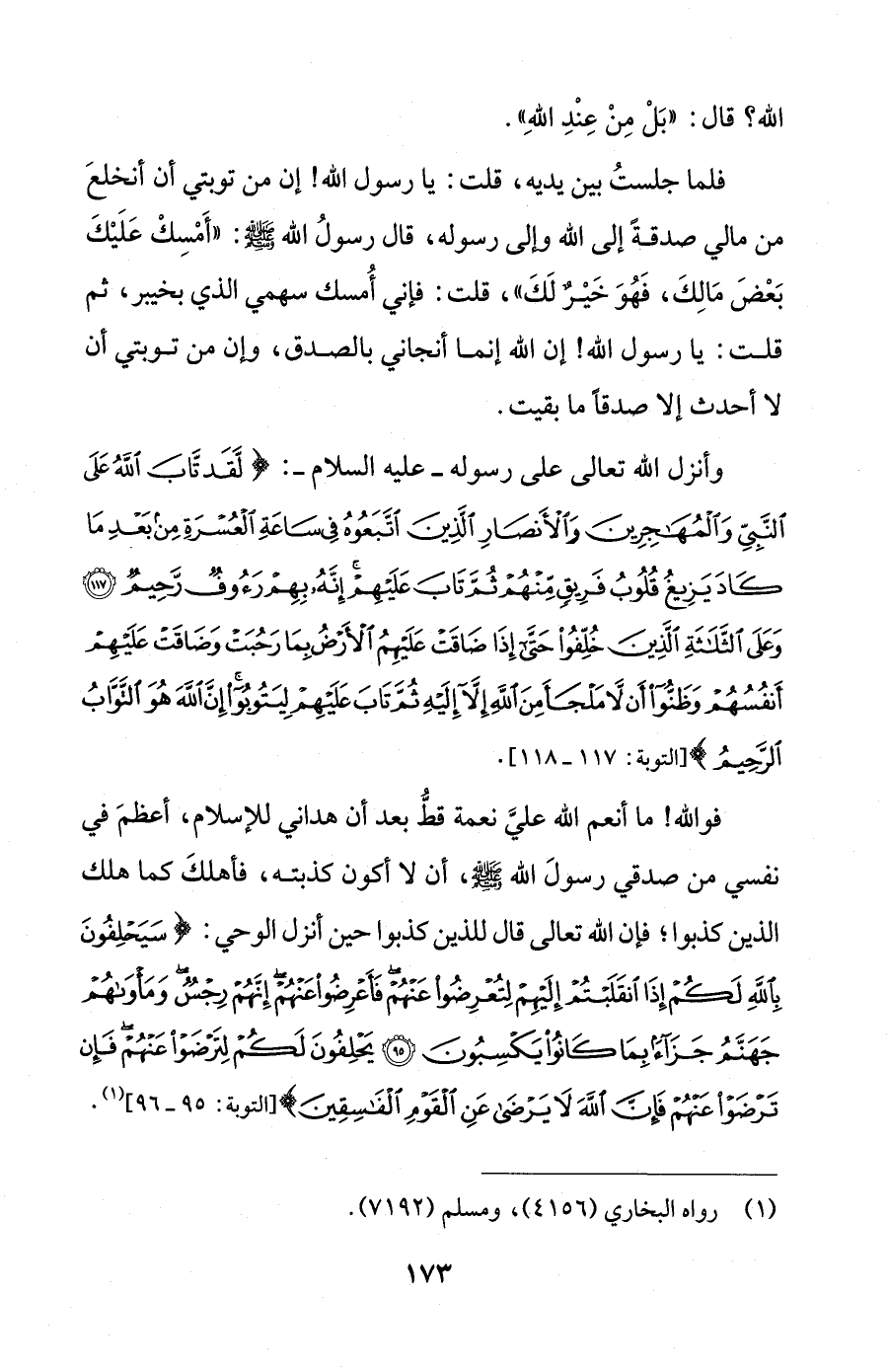 فلما جلستُ بين يديه، قلت: يا رسول الله! إن من توبتي أن أنخلعَ من مالي صدقةً إلى الله وإلى رسوله، قال رسولُ الله - صلى الله عليه وسلم -: "أَمْسِكْ عَلَيْكَ بَعْضَ مَالِكَ، فَهُوَ خَيْرٌ لَكَ"، قلت: فإني أُمسك سهمي الذي بخيبر، ثم قلت: يا رسول الله! إن الله إنما أنجاني بالصدق، وإن من توبتي أن لا أحدث إلا صدقًا ما بقيت.