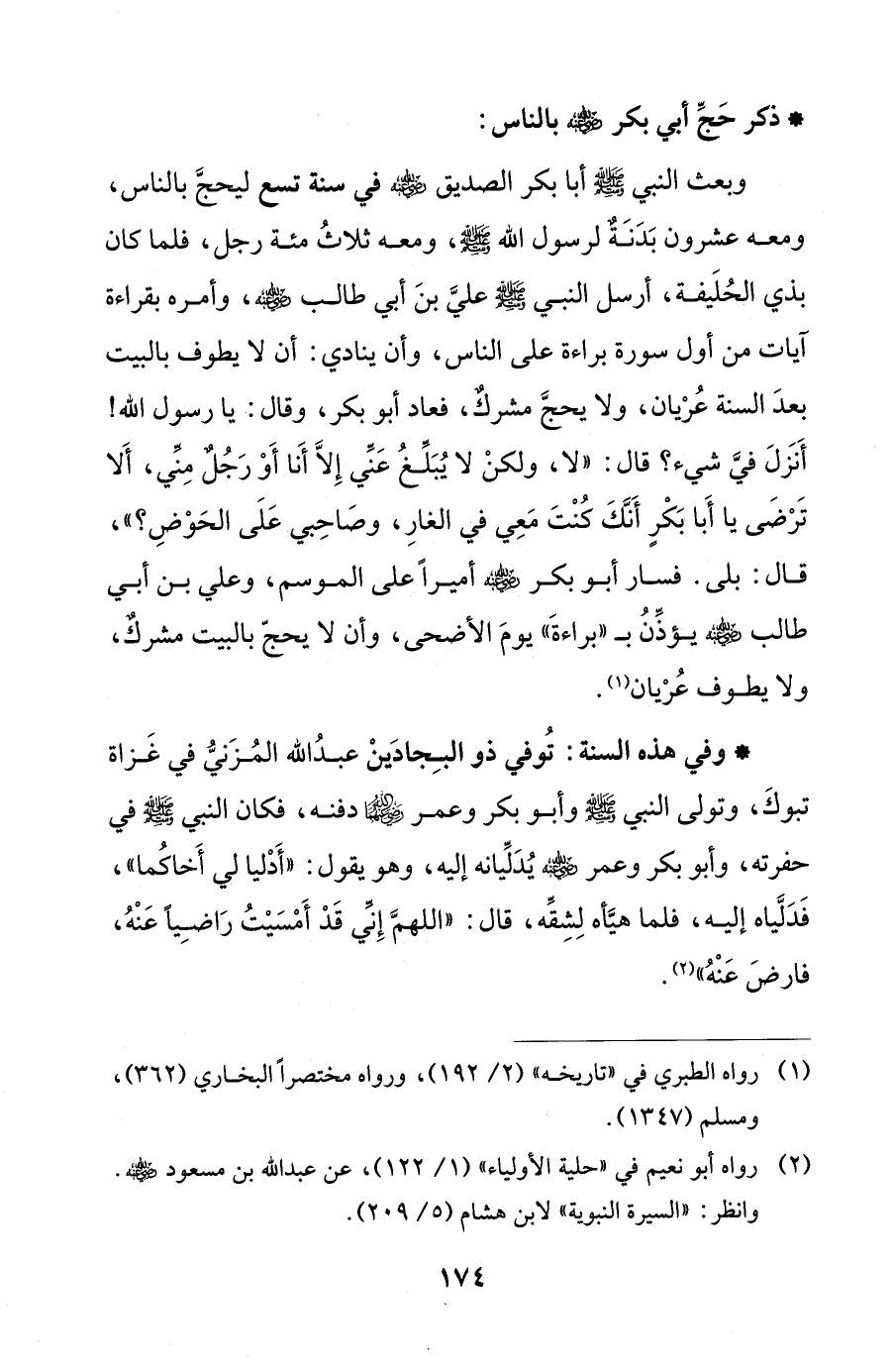 وبعث النبي - صلى الله عليه وسلم - أبا بكر الصديق - رضي الله عنه - في سنة تسع ليحجَّ بالناس، ومعه عشرون بَدَنَةٌ لرسول الله - صلى الله عليه وسلم -، ومعه ثلاثُ مئة رجل، فلما كان بذي الحُلَيفة، أرسل النبي - صلى الله عليه وسلم - عليَّ بنَ أبي طالب - رضي الله عنه -، وأمره بقراءة آيات من أول سورة براءة على الناس، وأن ينادي: أن لا يطوف بالبيت بعدَ السنة عُرْيان، ولا يحجَّ مشركٌ، فعاد أبو بكر، وقال: يا رسول الله! أَنَزلَ فيَّ شيء؟ قال: "لا، ولكنْ لا يُبَلِّغُ عَنِّي إِلَّا أَنا أَوْ رَجُلٌ مِنِّي، أَلا تَرْضَى يا أَبا بَكْرٍ أَنَّكَ كُنْتَ مَعِي في الغارِ، وصَاحِبي عَلَى الحَوْضِ؟ "، قال: بلى. فسار أبو بكر - رضي الله عنه - أميرًا على الموسم، وعلي بن أبي طالب - رضي الله عنه - يؤذِّنُ ب "براءةَ" يومَ الأضحى، وأن لا يحجّ بالبيت مشركٌ، ولا يطوف عُرْيان (¬1).