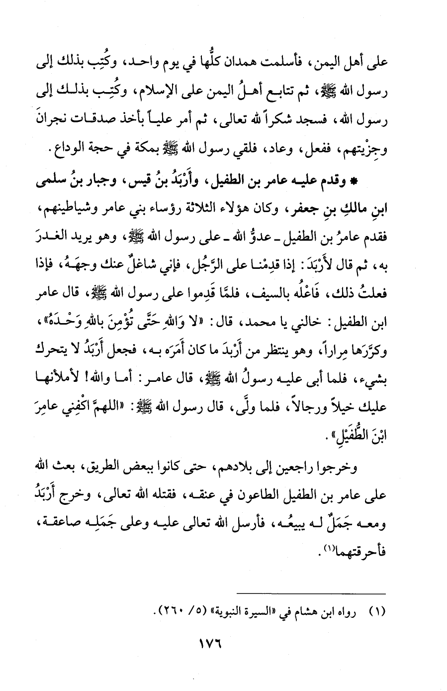 * وقدم عليه عامر بن الطفيل، وأَرْبَدُ بنُ قيس، وجبار بنُ سلمى ابنِ مالكِ بنِ جعفر، وكان هؤلاء الثلاثة رؤساء بني عامر وشياطينهم، فقدم عامرُ بن الطفيل - عدوُّ الله - على رسول الله - صلى الله عليه وسلم -، وهو يريد الغدرَ به، ثم قال لأَرْبَدَ: إذا قدِمْنا على الرَّجُل، فإني شاغلٌ عنك وجهَهُ، فإذا فعلتُ ذلك، فَاعْلُه بالسيف، فلمَّا قَدِموا على رسول الله - صلى الله عليه وسلم -، قال عامر ابن الطفيل: خالني يا محمد، قال: "لا وَاللهِ حَتَّى تُؤْمِنَ باللهِ وَحْدَهُ"، وكرَّرَها مِرارًا، وهو ينتظر من أَرْبدَ ما كان أَمَرَه به، فجعل أَرْبَدُ لا يتحرك بشيء، فلما أبى عليه رسولُ الله - صلى الله عليه وسلم -، قال عامر: أما والله! لأملأنها عليك خيلًا ورجالًا، فلما ولَّى، قال رسول الله - صلى الله عليه وسلم -: "اللهمَّ اكْفِني عامِرَ ابْنَ الطُّفَيْلِ".