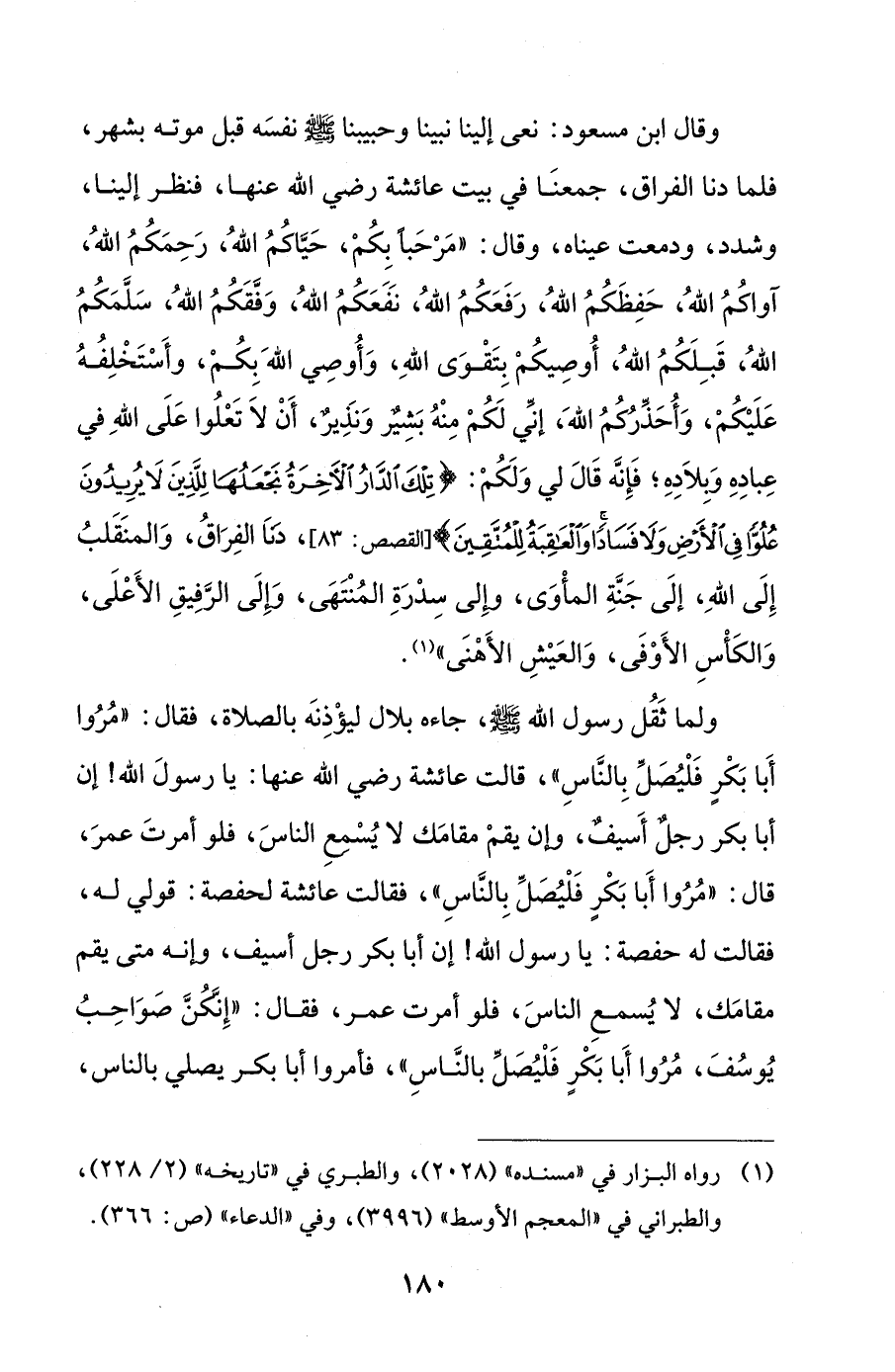 ولما ثَقُل رسول الله - صلى الله عليه وسلم -، جاءه بلال ليؤْذِنَه بالصلاة، فقال: "مُرُوا أَبا بَكْرٍ فَلْيُصَلِّ بِالنَّاسِ"، قالت عائشة رضي الله عنها: يا رسولَ الله! إن أبا بكر رجلٌ أَسيفٌ، وإن يقمْ مقامَك لا يُسْمعِ الناسَ، فلو أمرتَ عمرَ، قال: "مُرُوا أَبا بَكْرٍ فَلْيُصَلِّ بِالنَّاسِ"، فقالت عائشة لحفصة: قولي له، فقالت له حفصة: يا رسول الله! إن أبا بكر رجل أسيف، وإنه متى يقم مقامَك، لا يُسمعِ الناسَ، فلو أمرت عمر، فقال: "إِنَّكُنَّ صَوَاحِبُ يُوسُفَ، مُرُوا أَبا بَكْرٍ فَلْيُصَلّ بالنَّاسِ"، فأمروا أبا بكر يصلي بالناس،
