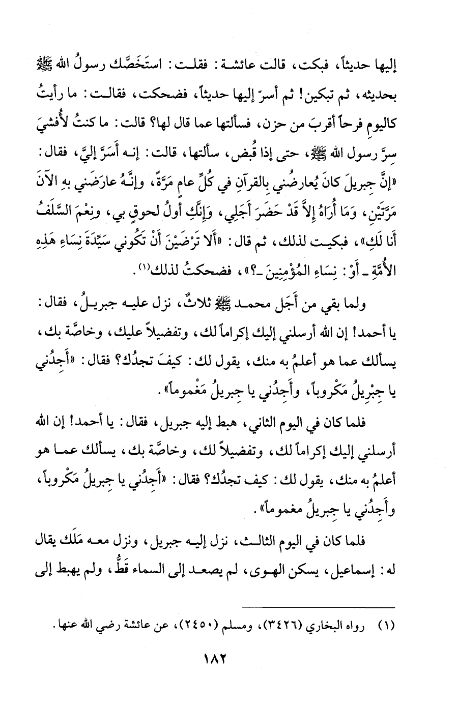 إليها حديثًا، فبكت، قالت عائشة: فقلت: استَخَصَّك رسولُ الله - صلى الله عليه وسلم - بحديثه، ثم تبكين! ثم أسرّ إليها حديثًا، فضحكت، فقالت: ما رأيتُ كاليومِ فرحًا أقربَ من حزن، فسألتها عما قال لها؟ قالت: ما كنتُ لأُفشيَ سِرَّ رسول الله - صلى الله عليه وسلم -، حتى إذا قُبض، سألتها، قالت: إنه أَسَرَّ إليَّ، فقال: "إنَّ جِبريلَ كانَ يُعارضُني بِالقرآنِ في كُلِّ عامٍ مَرَّةً، وَإِنَّهُ عارَضَني بهِ الآنَ مَرَّتَيْنِ، وَمَا أُرَاهُ إِلَّا قَدْ حَضَرَ أَجَلِي، وَإِنَّكِ أولُ لحوقٍ بي، ونِعْمَ السَّلَفُ أَنَا لَكِ"، فبكيت لذلك، ثم قال: "أَلا تَرْضَيْنَ أَنْ تَكُوني سَيِّدَةَ نِسَاءِ هَذِهِ الأُمَّةِ - أَوْ: نِسَاءِ المُؤْمِنِينَ -؟ "، فضحكتُ لذلك (¬1).