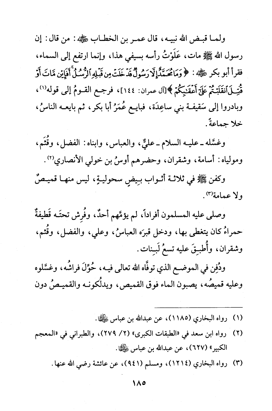 وصلى عليه المسلمون أفرادًا، لم يؤمَّهم أحدٌ، وفُرِش تحتَه قَطيفةٌ حمراءُ كان يتغطى بها، ودخل قبرَه العباسُ، وعلي، والفضل، وقُثم، وشقران، وأُطبِقَ عليه تسعُ لَبِنات.