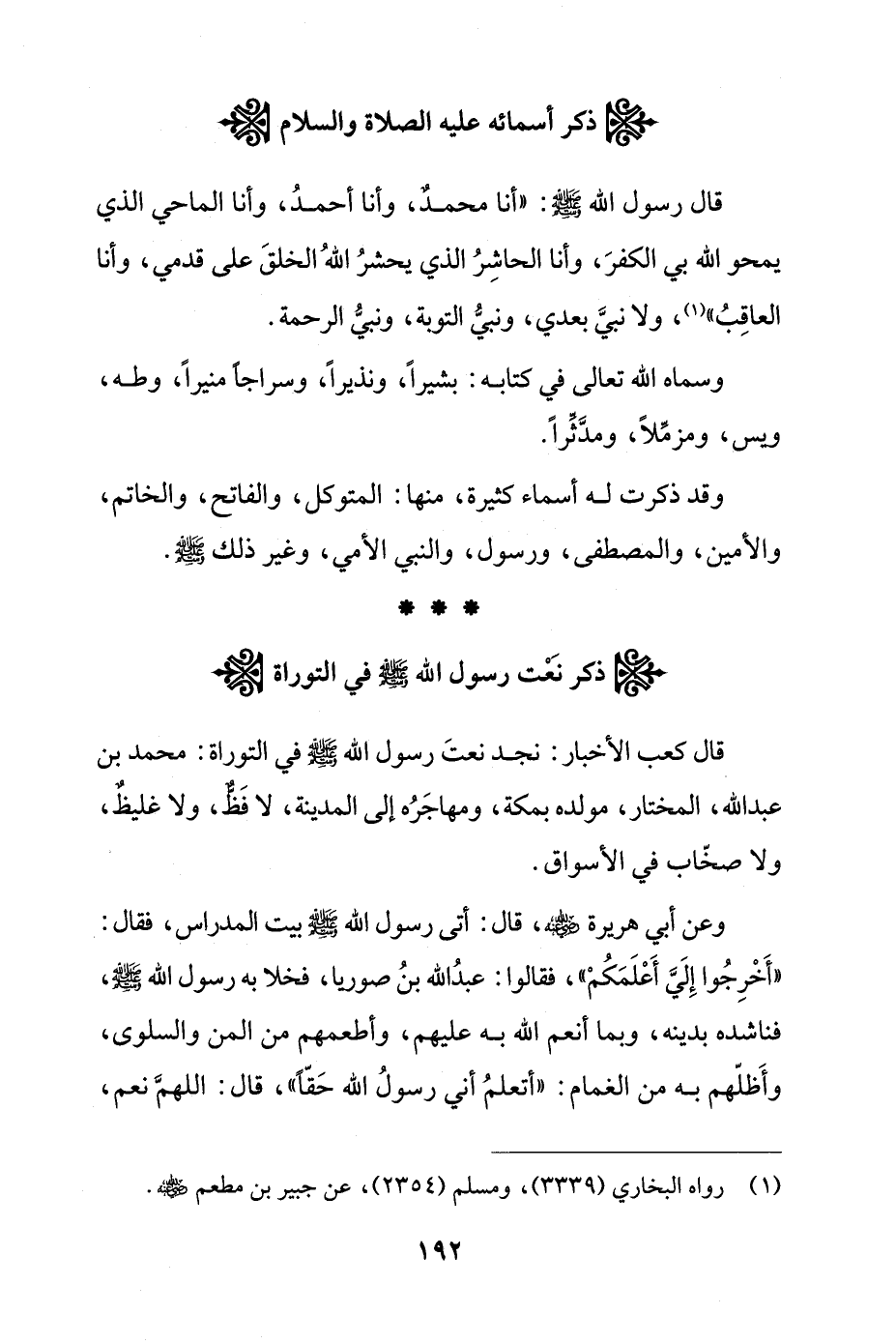 وسماه الله تعالى في كتابه: بشيرًا، ونذيرًا، وسراجًا منيرًا، وطه، ويس، ومزمِّلًا، ومدَّثِّرًا.