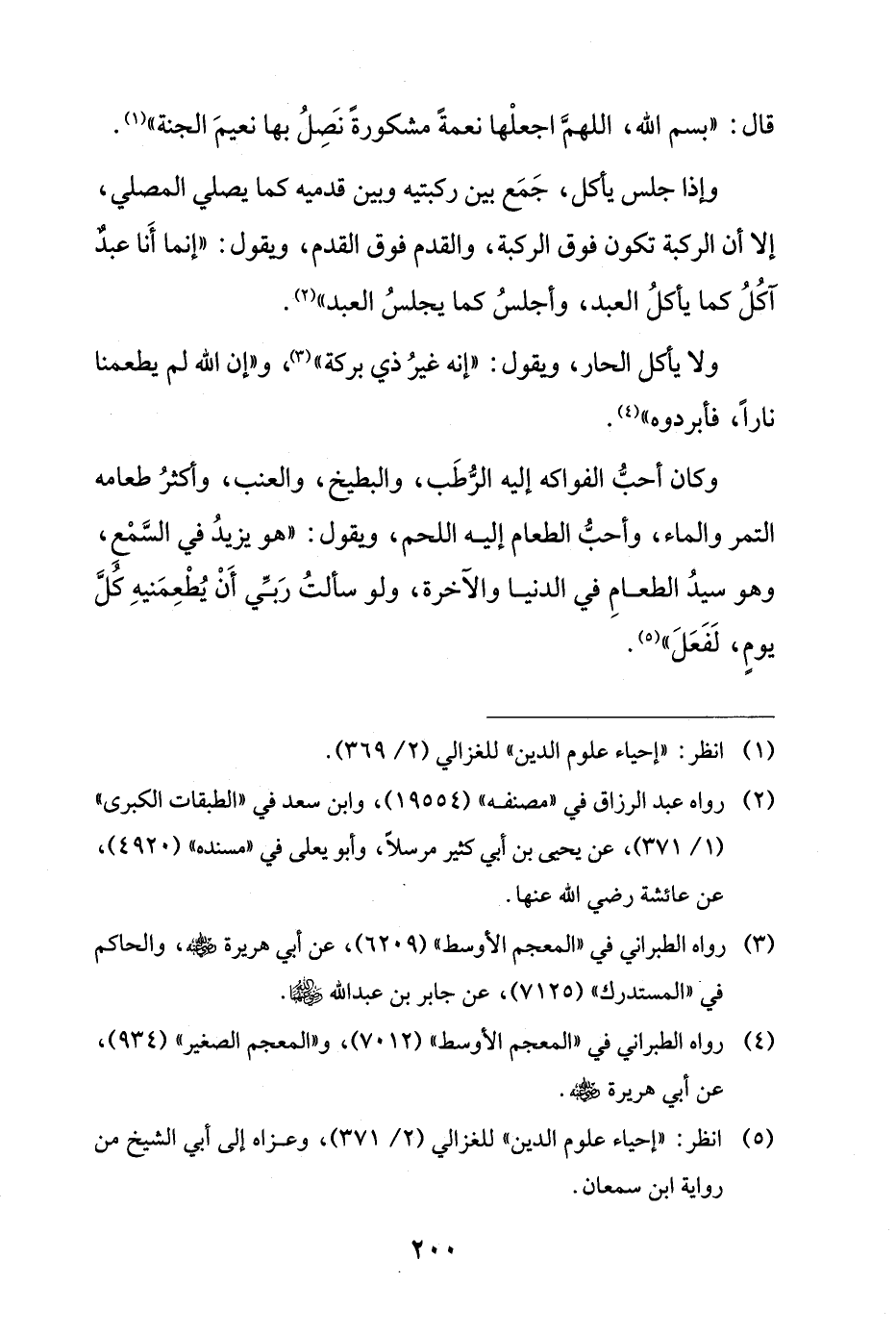 وكان أحبُّ الفواكه إليه الرُّطَب، والبطيخ، والعنب، وأكثرُ طعامه التمر والماء، وأحبُّ الطعام إليه اللحم، ويقول: "هو يزيدُ في السَّمْعِ، وهو سيدُ الطعامِ في الدنيا والآخرة، ولو سألتُ رَبِّي أَنْ يُطْعِمَنيهِ كُلَّ يومٍ، لَفَعَلَ" (¬5).