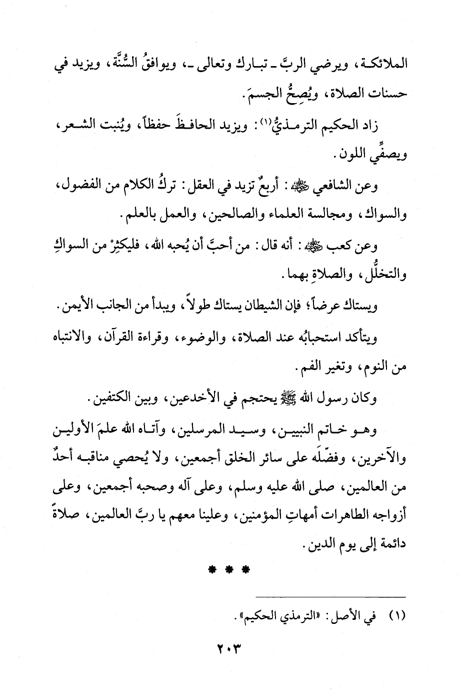 الملائكة، ويرضي الربَّ - تبارك وتعالى -، ويوافقُ السُّنَّة، ويزيد في حسنات الصلاة، وُيصِحُّ الجسمَ.